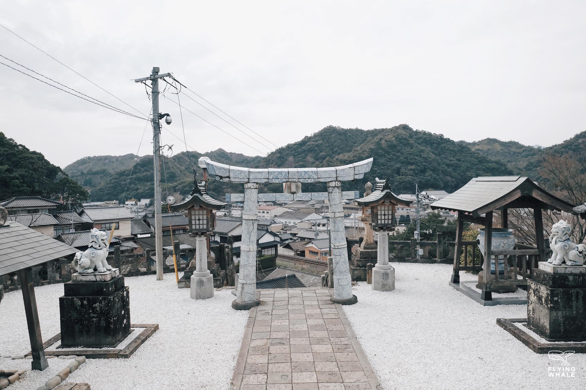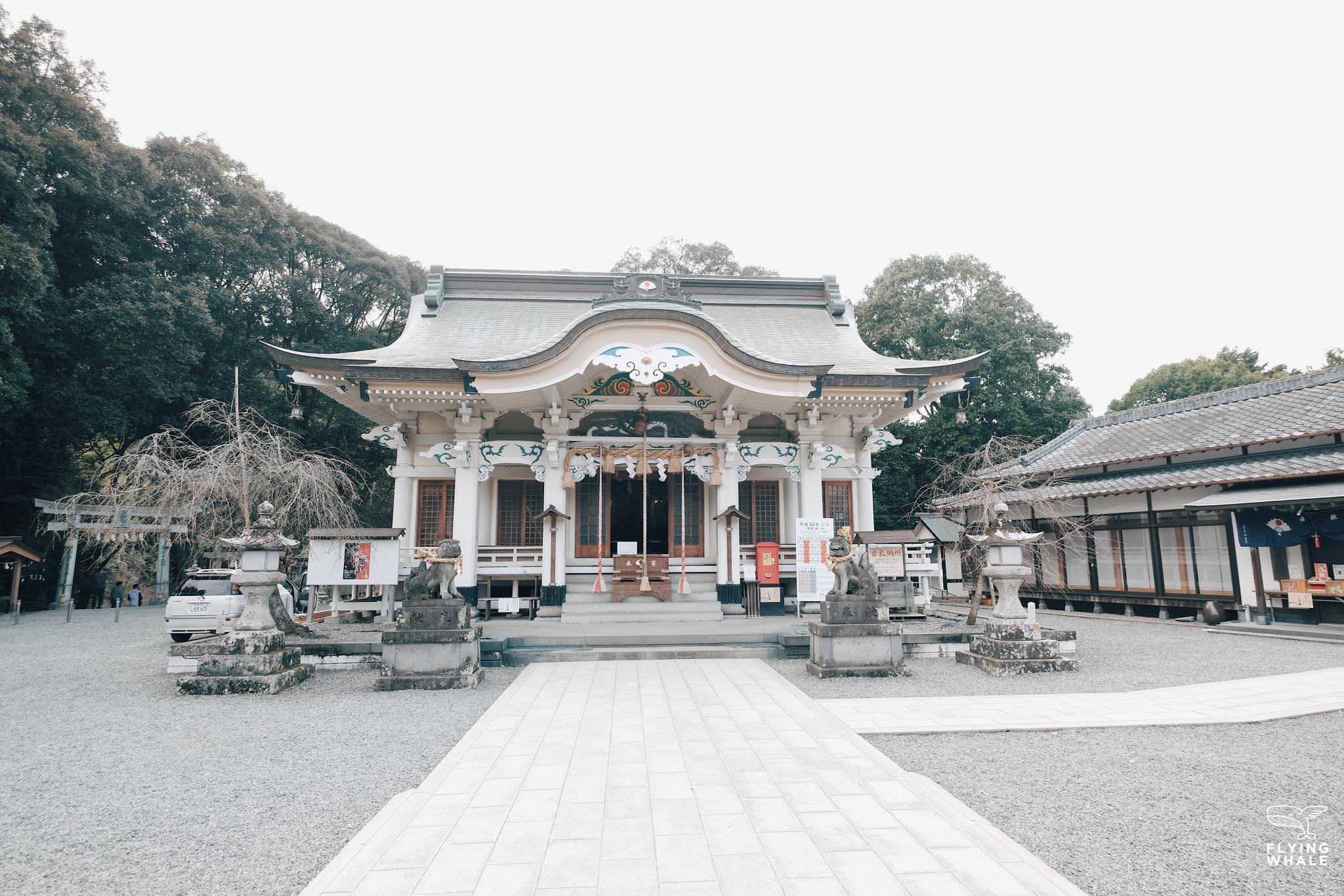 ศาลเจ้าที่เมืองนี้มีจุดเด่นคือศาลเจ้าเป็นสีขาว แทนที่จะเป็นสีแดงเหมือนกับศาลเจ้าทั่วไปที่เราพบได้ทั่วญี่ปุ่น โดยสาเหตุที่เป็นสีขาวเพราะตัวแทนส่งสาสน์ของศาลเจ้าแห่งนี้คือนกสีขาว (นกกระยาง) และในบริเวณศาลเจ้านั้นยังมีต้นไม้ใหญ่สองต้นซึ่งมีลำต้นที่ต้นกันและภายในก็จะมีศาลเจ้าอยู่ด้านในอีกที่ โดยที่ 1 ปีจะเปิดให้คนเข้าไปขอพรได้แค่ปีละครั้ง และถ้าเราสังเกตดีๆ รูปลักษณ์ของต้นไม้ใหญ่สองต้นนี้คือต้นแบบของต้นไม้ในการ์ตูนเรื่องโทโทโร่เพื่อนรักนั้นเอง