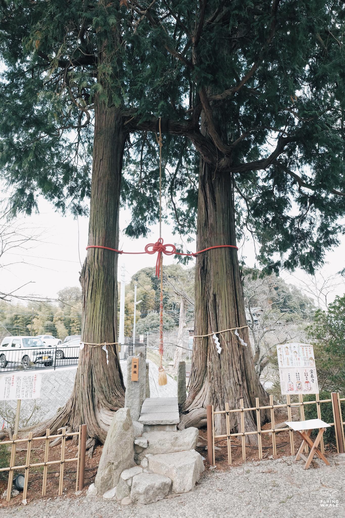 ทางเข้าวัดจะมีต้นไม้คู่รัก ถ้าใครอยากจะขอพรสามารถไปซื้อกระดิ่งเพื่อมาผูกตอนขอพร (กระดิ่งสามารถซื้อได้ภายในศาลเจ้า)