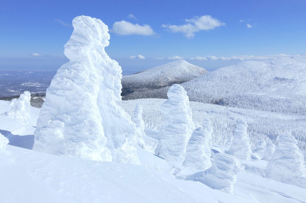 เทือกเขาซะโอที่ทอดยาวข้ามจังหวัดมิยางิและจังหวัดยามากาตะนั้นมีสภาพภูมิอากาศและผืนป่าที่มีความพิเศษ จึงก่อกำเนิดปรากฎการณ์ “จุเฮียว” หรือ “Snow Monster” ปีศาจหิมะจากน้ำแข็งนี้สูงตระหง่านเกือบ 5 เมตร ตั้งเรียงรายจากยอดเขาถึงพื้นภูเขา ที่เกิดจากหิมะและน้ำแข็งทับถมต้นไม้ ซึ่งมีรูปร่างที่แตกต่างกันไป เป็นความงดงามและทรงพลังของธรรมชาติ