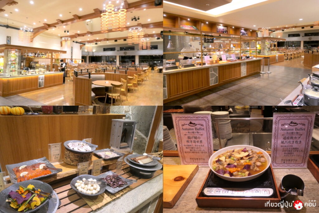 มื้อเช้าและเย็นของโรงแรมจะเสิร์ฟเป็นสไตล์บุฟเฟ่ต์ที่มีอาหารให้เลือกทานเยอะมาก ไม่ว่าจะเป็น ซูชิ, เทมปุระ, สเต๊ก และ อีกหลายเมนูที่เชฟจะปรุงให้สดๆ ห้องอาหารกว้างและมีกระจกหน้าต่างบานใหญ่ที่มองเห็นวิวทะเลสาบโทยะได้เต็มๆตา