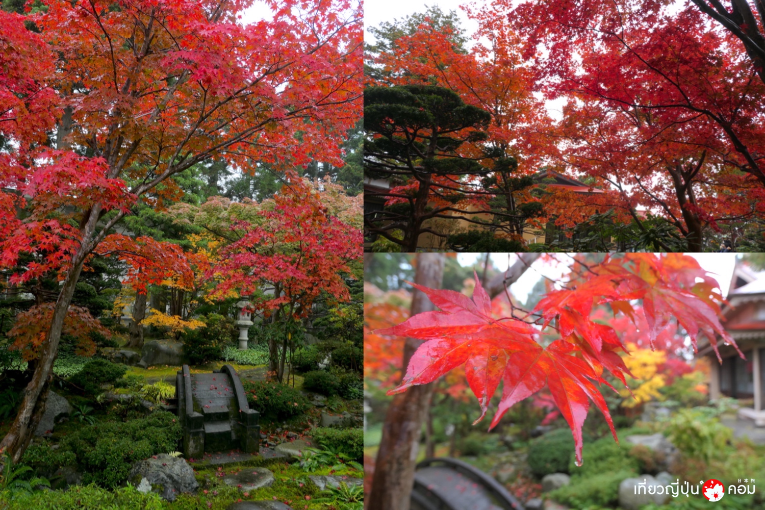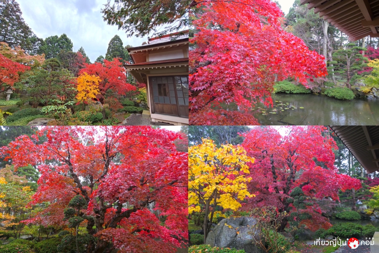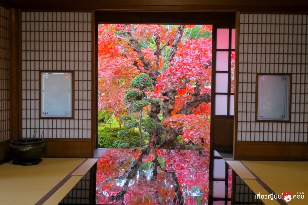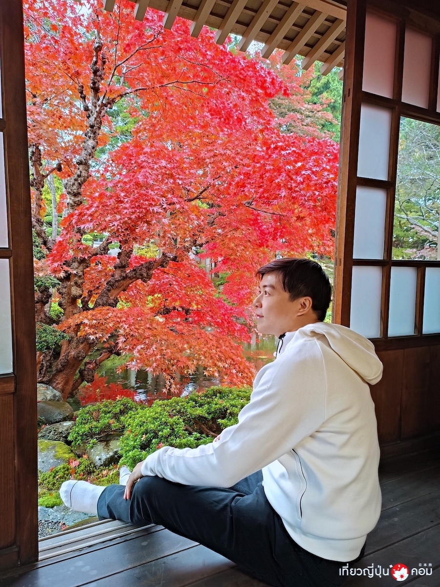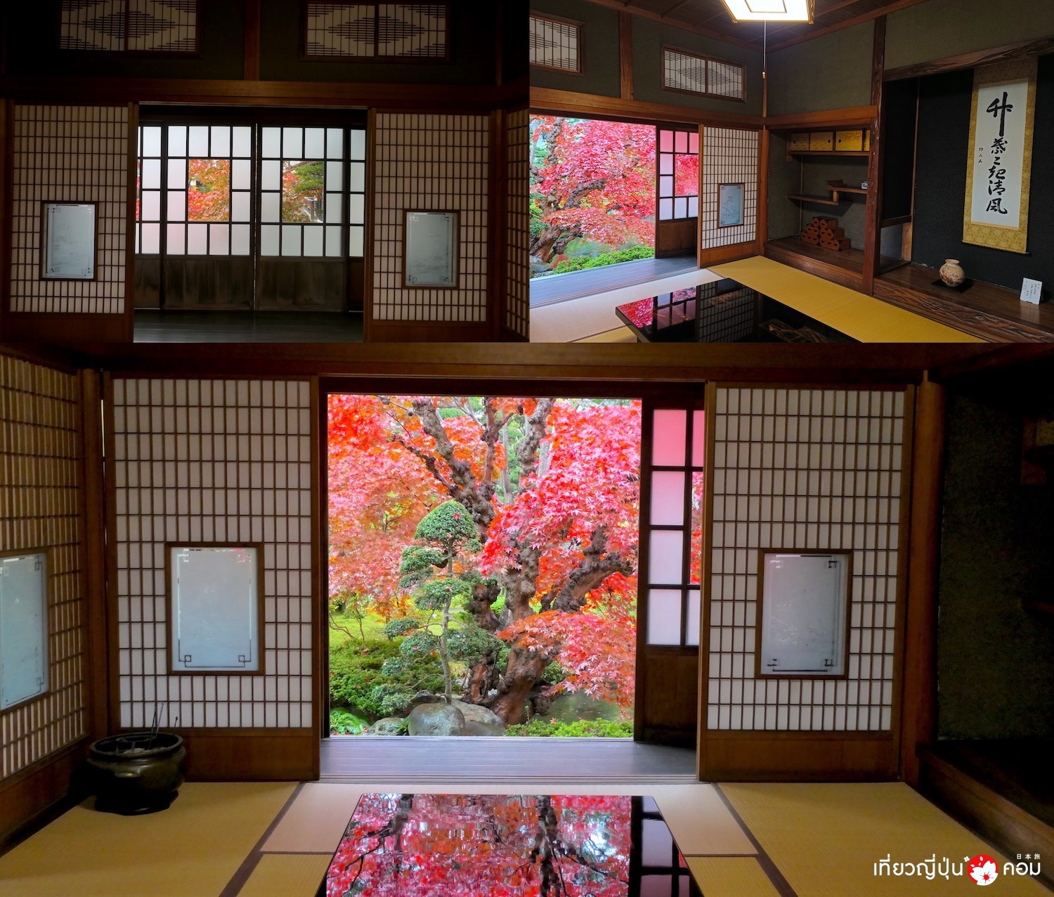 จากระเบียงที่มีบานประตูเปิดออกสู่สวนญี่ปุ่นมองเห็นทางเดินรอบบ่อน้ำ และมีต้นโมมิจิที่กำลังเข้าสู่ช่วงพีค เปลี่ยนสีสันอย่างสวยงามในช่วงปลายเดือนต.ค.ซึ่งเป็นช่วงเวลาที่แนะนำที่สุด