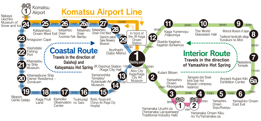สำหรับการเดินทางภายในเมือง Kaga นั้น มีรถ CANBUS ให้บริการ โดยจะวิ่งวนเป็นทางเดียวไปตามเส้นทางที่มีแหล่งท่องเที่ยวของเมืองตั้งอยู่ เริ่มต้นที่สถานี JR Kaga Onsen/ Abio City Kaga/ Kaga City Art Museum และวนมาจบที่สถานีเดิม แบ่งเส้นการเดินทางรถเป็นสองเส้นด้วยกัน คือ Interior Route และ Coastal Route โดยจะมีอีกหนึ่งเส้นพิเศษที่เดินทางมาจากสนามบิน Komatsu