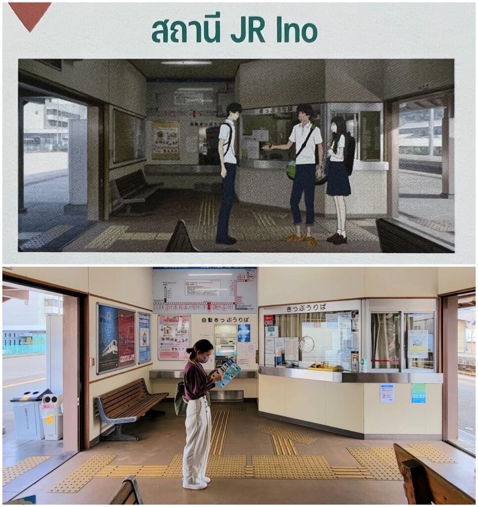 สถานที่ที่ 2 ก็คือสถานี Ino ที่ Suzu เปลี่ยนรถไฟที่สถานีนี้เพื่อไปยังโรงเรียนที่อยู่ในเมือง รายละเอียดต่าง ๆ เช่น ม้านั่งและเคาท์เตอร์ขายตั๋วทำออกมาได้ละเอียด ตรงกับฉากของภาพยนตร์จริง ๆ เปรียบเทียบได้เลย