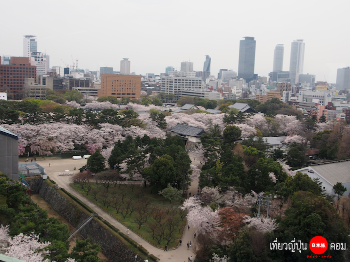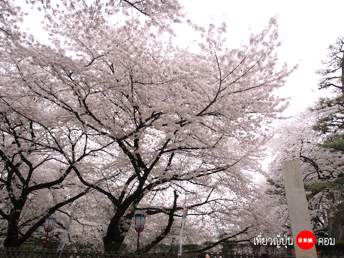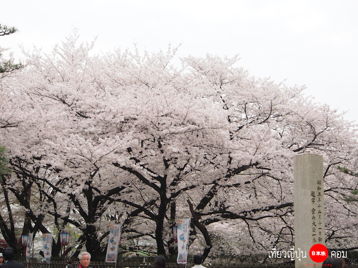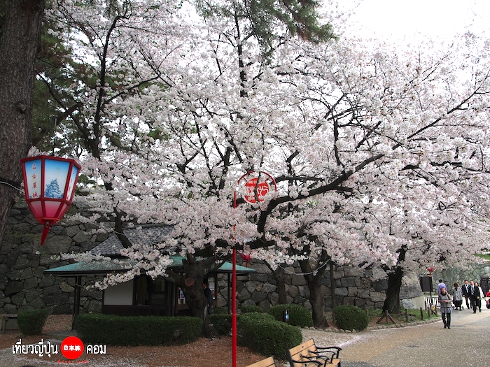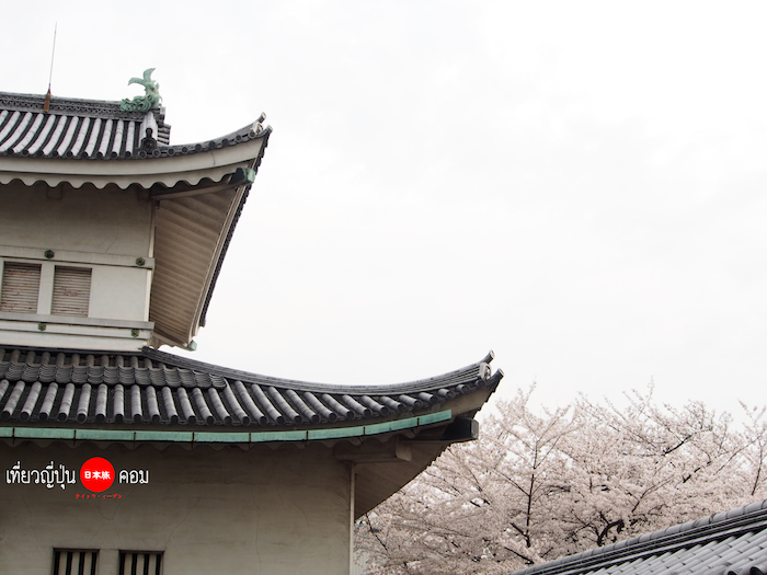 มองเห็นซากุระบานเต็มต้นอยู่รอบๆปราสาท