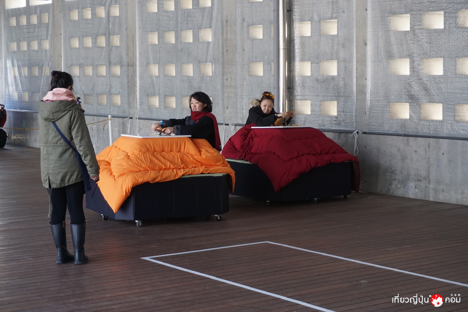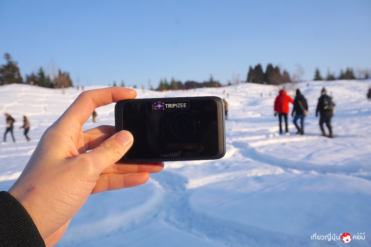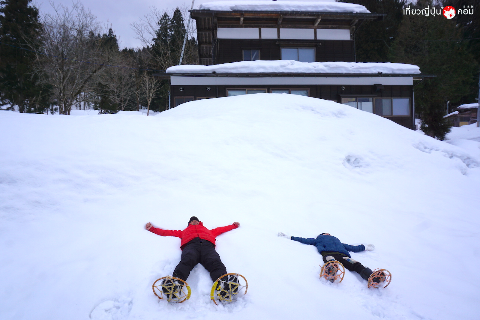 เช็คอินแล้วไม่รู้ทำอะไร คุณลุงคุณป้าจะพาเราออกมาเดินเล่นบนหิมะ ด้วยรองเท้าคันจิกิแบบโบราณ