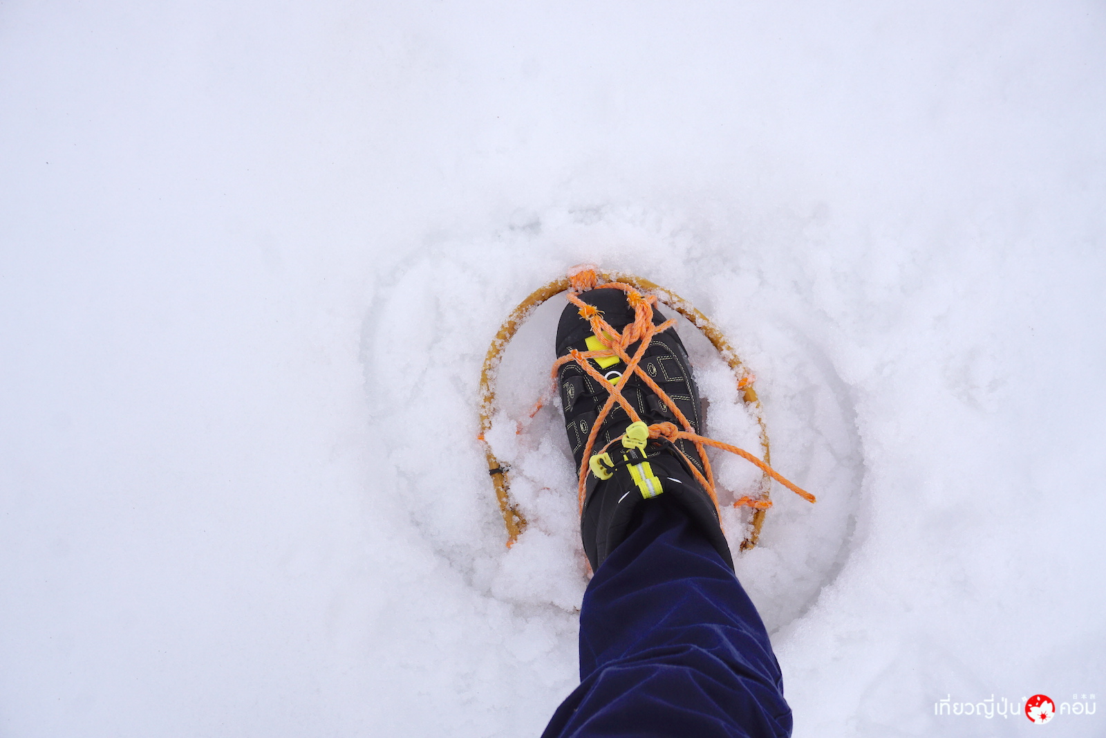 ถ้าเราใส่รองเท้าสานแบบนี้ ต่อให้หิมะจะสูงแค่ไหน เราก็สามารถเดินได้ แบบไม่หล่นลงไปแน่นอน แต่ต้องผูกเชือกให้แน่น คอยระวังไม่ให้รองเท้าหลุดน