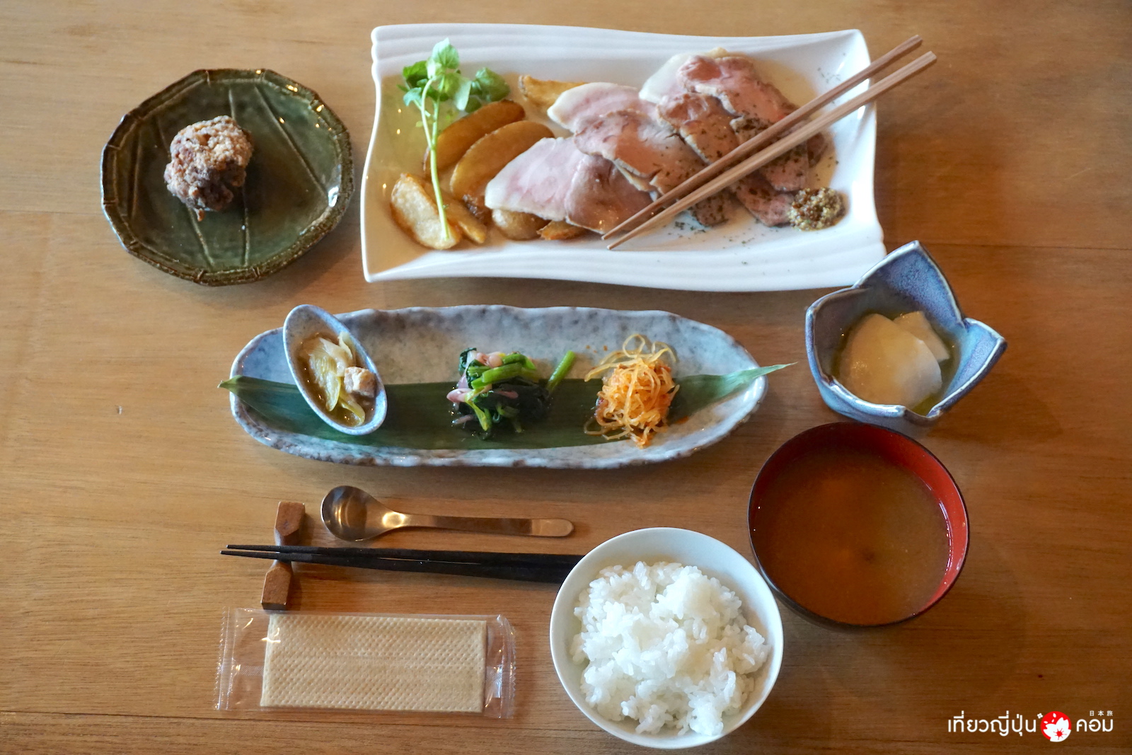 มื้ออาหารเที่ยง ที่ใช้วัตถุดิบท้องถิ่น อย่างข้าวแบรนด์โทคะมะจะ และ เนื้อหมูสึมาริ จัดวางได้อย่างลงตัว สวยงามตามสไตล์เมืองอาร์ต