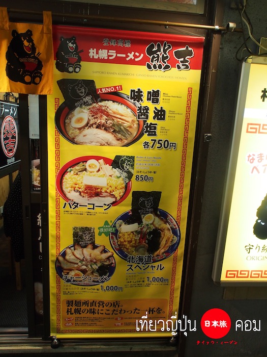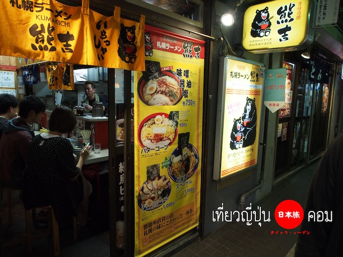 ร้านที่จะพาไปชิมในวันนี้ สะดุดตาครั้งแรกที่ป้ายหน้าร้าน ใช้รูปหมีสีดำ พอมองเข้าไปที่ป้ายเมนูก็มีสาหร่ายที่สกรีนเป็นรูปหมีอีก แถมคนกินกันแน่นร้าน แสดงว่าร้านนี้ต้องไม่ธรรมดาแน่ๆ ตั้งอยู่ Susukino 3-chome ในตรอก Ramen yokocho เข้าไปด้านใน มองหาป้ายไฟสีเหลืองที่มีรูปหมีสีดำ และเขียนชื่อร้านว่า 熊吉 Kumakichi