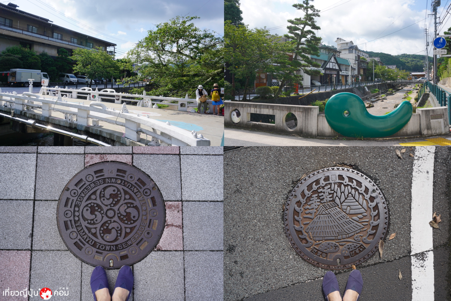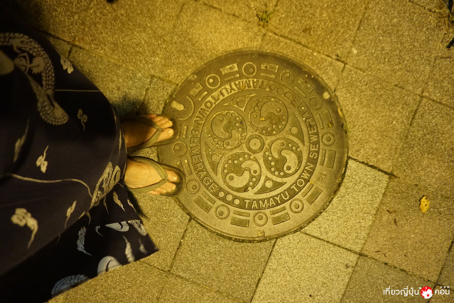 บรรยากาศในตัวเมืองทะมะยู และฝาท่อที่มีสัญลักษณ์เครื่องรางประจำเมือง