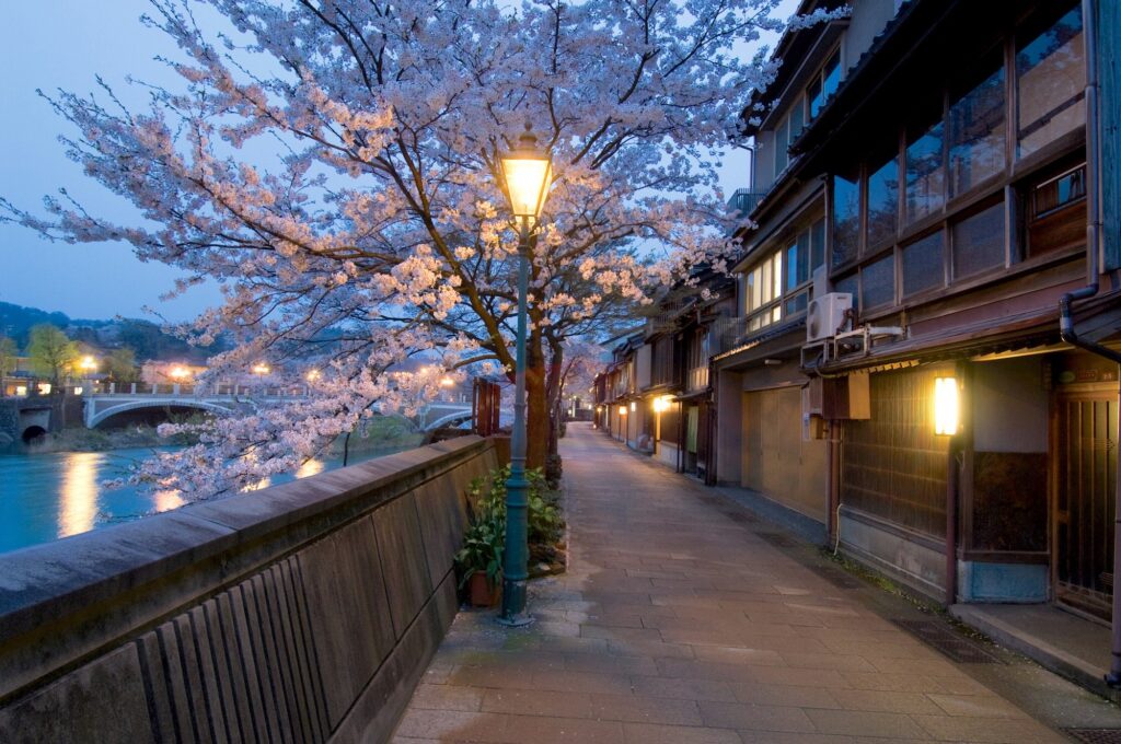 ย่านโรงน้ำชาคาซุเอะมาจิ (Kazuemachi Chayagai) เป็น 1 ใน 3 เขตเกอิชาของคานาซาวะ ตั้งอยู่ตรงข้ามฝั่งสะพานข้ามแม่น้ำอาซาโนะ (Asanogawa) จากเขตฮิกาชิชายะ เรียงรายด้วยร้านอาหารและร้านน้ำชาแบบดั้งเดิม ในช่วงกลางคืนจะได้ยินเสียงชามิเซ็นและกลองจากการละเล่นของเกอิโกะ ให้บรรยากาศย้อนยุคแบบญี่ปุ่น