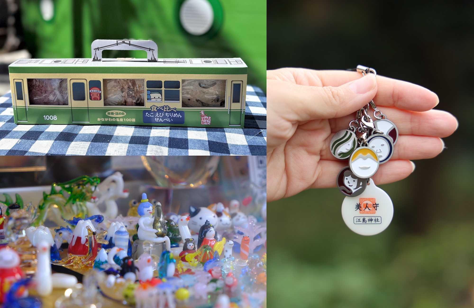 • งานแก้วประดิษฐ์จากเอโนชิมะ เช่น เครื่องประดับและแก้วน้ำ ซึ่งมีลวดลายเกี่ยวกับตำนานเทพเจ้าเบ็นไซเท็น มังกรเทพเจ้า และเทพเจ้าแห่งโชคลาภทั้งเจ็ด ถือเป็นของฝากสุดพิเศษที่แสดงถึงเรื่องราวและตำนานในพื้นที่เอโนะชิมะได้เป็นอย่างดี