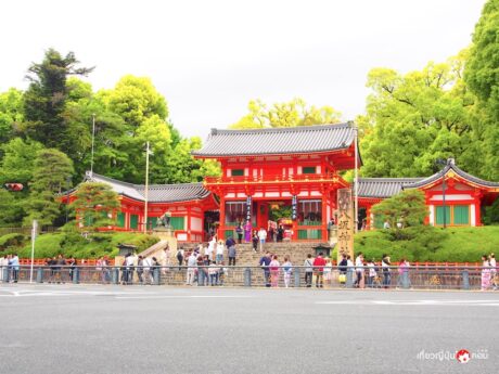 จากนั้นเดินต่อไปที่หัวถนนจะพบกับสามแยกขนาดใหญ่ ด้านหน้าของเราคือทางเข้าศาลเจ้ายะซะกะ (Yasaka Shrine) สีแดงสดสัญลักษณ์ของย่านกิออน หรือที่รู้จักกันในชื่อของศาลเจ้ากิออน เป็นหนึ่งในศาลเจ้าที่เก่าแก่และมีชื่อเสียงที่สุดแห่งหนึ่งของญี่ปุ่น มีอายุมากกว่า 1350 ปี