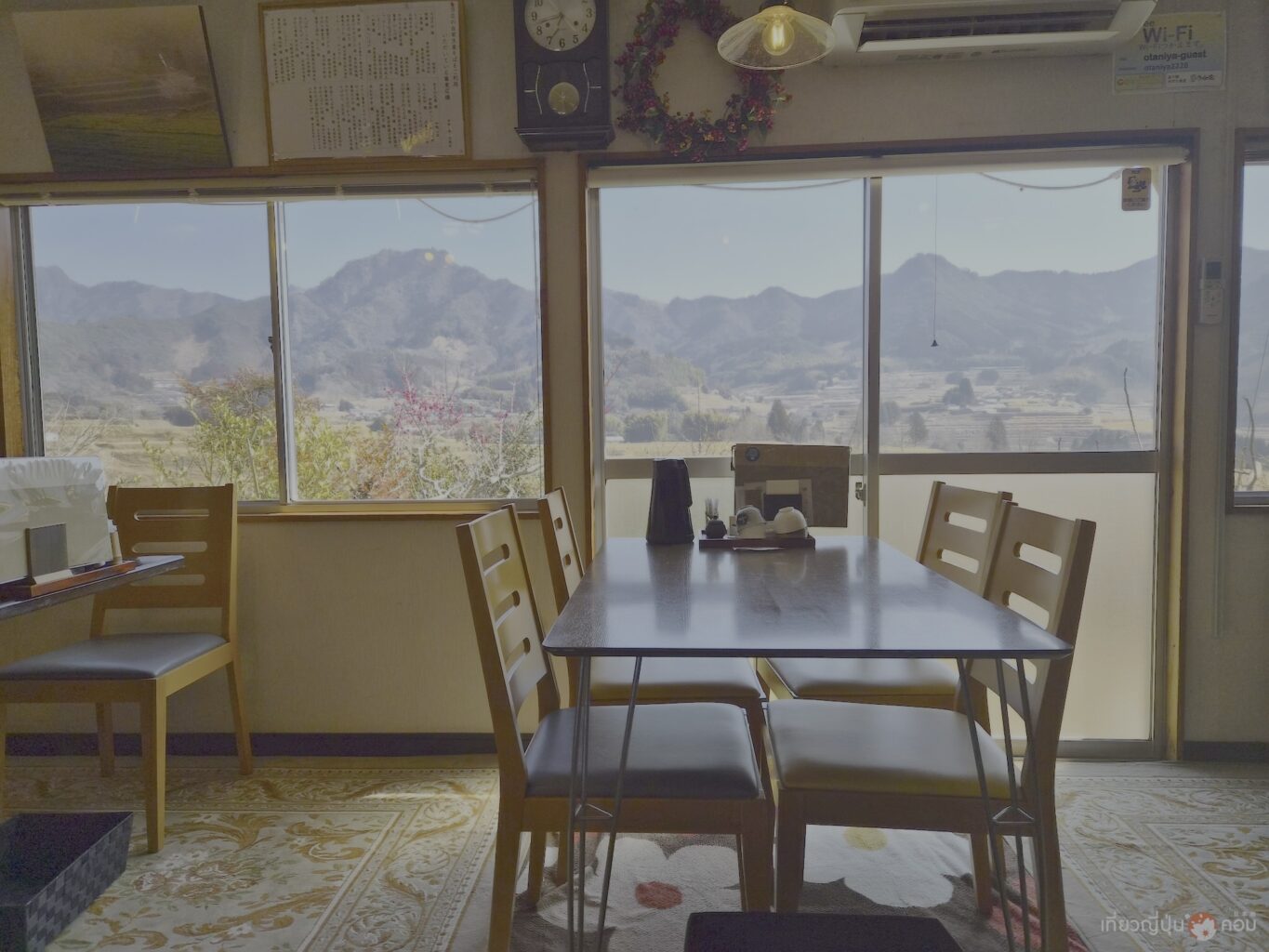 บรรยากาศของร้านเป็นแบบ บ้านไม้ชนบทญี่ปุ่น รายล้อมด้วยธรรมชาติและวิวชนบทของทาคาจิโฮะ บางมุมสามารถมองเห็นทุ่งนาแบบขั้นบันไดของภูเขา ทำให้บรรยากาศเหมือนมากินข้าวที่บ้านญาติในชนบทญี่ปุ่น