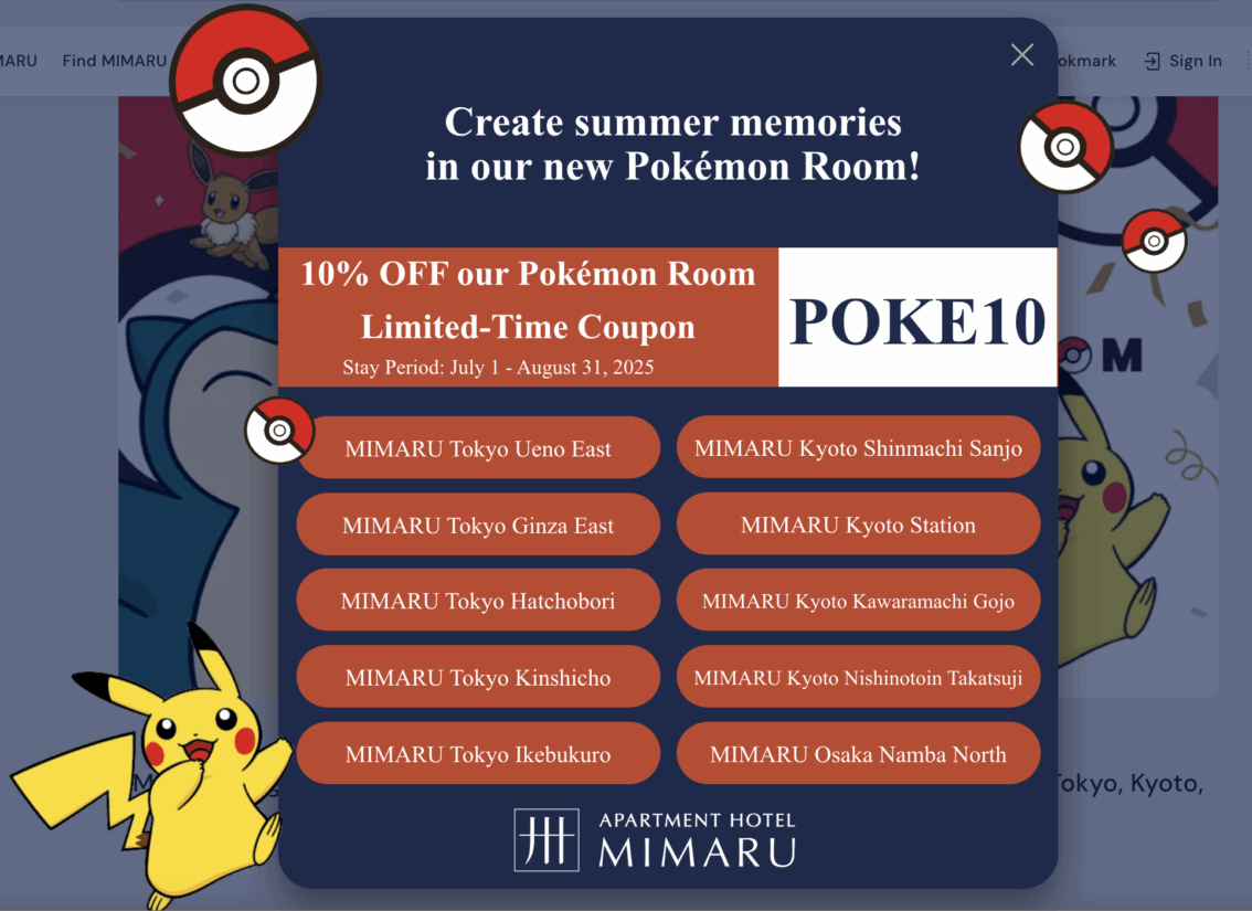 ได้ทำการอัปเกรด Pokémon Room ห้องพักธีมโปเกมอนใหม่ล่าสุด เริ่มให้บริการตั้งแต่วันที่ 1 กรกฎาคม 2025 ณ 10 สาขาในโตเกียว เกียวโต และโอซาก้า ภายใต้คอนเซ็ปต์ “More Pokémon. Deeper Immersion. More Fun for Families.”