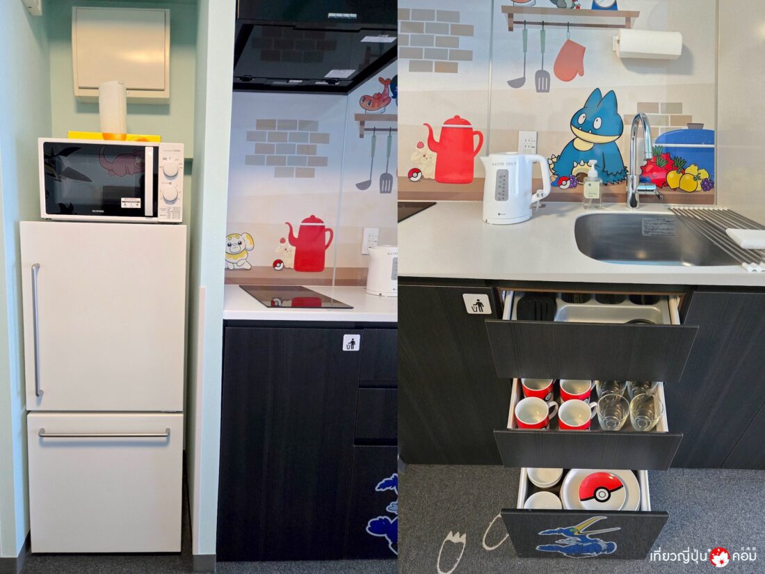 สิ่งอำนวยความสะดวกภายในห้องครบครัน ไม่ว่าจะเป็นห้องครัวพร้อมโต๊ะอาหาร เตาไฟฟ้า ไมโครเวฟ ตู้เย็น กาต้มน้ำ และชุดจานชามลายโปเกบอล