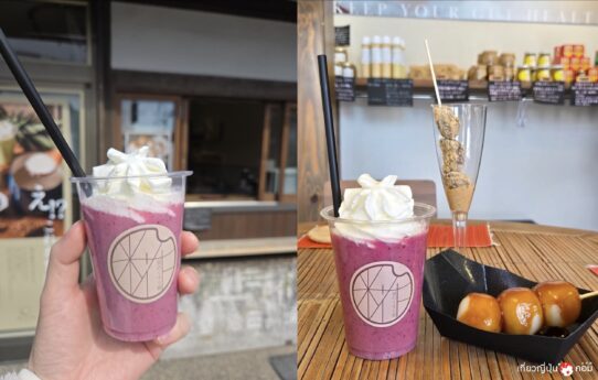 ร้าน Tabi no Kusuribako แลกซื้อขนมดังโงะได้ด้วยคูปอง 2 ใบ (ปกติ 350 เยน) แล้วก็ซื้อเครื่องดื่มที่มีส่วนผสมของอามะสาเกเพิ่ม