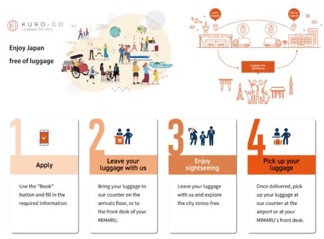 เริ่มต้นทริปญี่ปุ่นแบบไร้กังวลด้วยบริการจัดส่งกระเป๋า KURO-GO จาก MIMARU! ไม่ว่าจะเป็นการส่งกระเป๋าจากสนามบินถึง MIMARU และจาก MIMARU กลับสนามบิน เพื่อที่เราจะได้เดินทางเข้าเมืองตัวปลิวโดยไม่ต้องกังวลเรื่องสัมภาระ จองผ่านเว็บไซต์ KURO-GO มีวิธีใช้บริการง่ายๆ ใน 4 ขั้นตอน