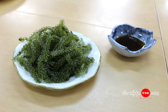 Umi budo หรือสาหร่ายพวงองุ่นจิ้มกับซอสคล้ายๆกับโชยุ รสชาดกรุบกรอบคล้ายกับทานไข่ปลา