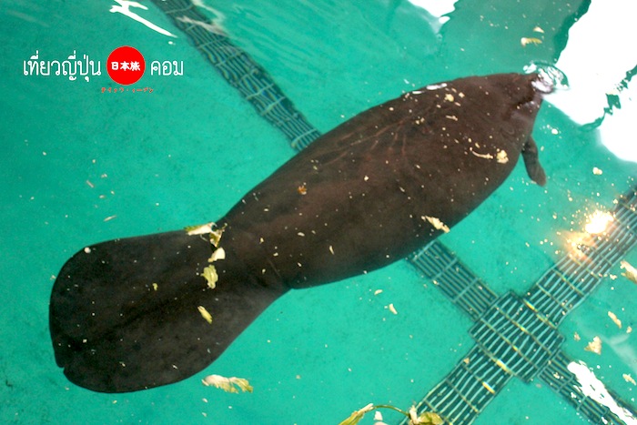 ที่บ่อใกล้ๆกันก็มีเจ้าพะยูนตัวใหญ่ แหวกว่ายไปมาพร้อมกับกินผักกาดขาวอย่างสบายใจ