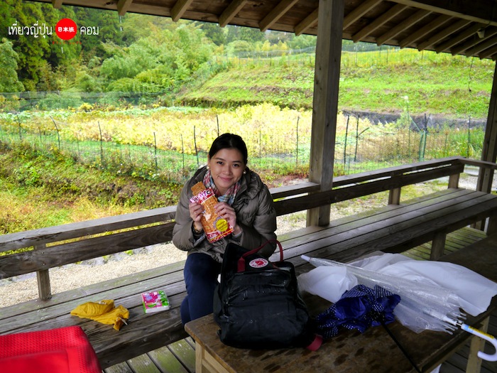 ยิ่งเดินไป ฝนยิ่งตกหนัก เดินๆ หยุดๆ พยายามเดินตามกลุ่มฝรั่งให้ทัน กลัวหลง แต่ก็มีป้ายคอยบอกทางตลอด และมีระฆังให้เราเคาะ เพื่อไล่หมีด้วยค่ะ เราก็เคาะดังๆ หมีจะได้กลัว ไม่กล้ามาทักทายเรา ทางเดินเป็นแบบขึ้นเขา ลงเขา เดินข้ามถนน ผ่านบ้านคน เส้นทางเดินเท้าทั้งหมด ประมาณ 8 กม. เรากับเพื่อนเดินมาได้ประมาณเกือบ 4 กม. ถึงศาลาพักแวะกินเสบียงของเรา ปลาย่างรสเผ็ด “Bento” เพื่อเรียกพลัง แล้วเราก็คิดกันกับเพื่อนว่า นี่แค่ครึ่งทางเราใช้เวลาเกือบ 2 ชั่วโมง ตอนนั้นก็ปาเข้าไปบ่ายคล้อยแล้ว ถ้าเดินกันต่อจนถึงเมือง Tsumago ก็คงมืด เดินเล่นไม่ได้อีก ฝนก็ไม่มีทีท่าจะหยุดเลย …. เรา 2 คนตัดสินใจเดินย้อนกลับไปที่ Magome กันดีกว่า แล้วคราวหน้าเราจะกลับมาทำให้ Hiking Mission นี้สำเร็จ คราวหน้าเราจะพร้อมรับทุกสภาพอากาศแบบสุดๆ