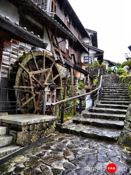 เดินไปเรื่อยๆ จนถึงจุดชมวิว แวะพักและรอเผื่อมีเพื่อนร่วมทางที่จะเดินไปกันเราบ้าง นั่งอยู่ 10 นาที คนญี่ปุ่นที่เค้ามาเที่ยวกัน เค้ายังไม่ดันทุรังเดินขึ้นมาถึงจุดชมวิวกันเลยค่ะ เค้าเห็นฝนตกเค้าก็ถอดใจแวะนั่งจิบชากินซาลาเปาปิ้งกัน(ของกินประจำถิ่น) ให้ร่างกายอบอุ่น แต่เราไม่ย่อท้อ นั่งรออีกหน่อย ก็มีกลุ่มฝั่งวัยรุ่น 4-5 คน และ คู่สามี-ภรรยา ชาวสวิส แต่งตัวกันฝนพร้อม เราก็ถามเค้าว่าจะเป็นไป Tsumago ใช่มั้ยค่ะ ….เสียงสวรรค์…เค้าตอบมาใช่ จะเดินไปด้วยกันมั้ย มันแน่นอนอยู่แล้ว นั่งรอมาเพื่อสิ่งนี้ เดินตามฝรั่งกลุ่มใหญ่ไปต้อยๆ เลย (อยากจะบอกฝรั่งเค้าเตรียมพร้อมกันมาก ทั้งรองเท้ากันน้ำ เป้แบบเดินป่า เสื้อกันฝน ไม่การร่มกันนะคะ เพราะการเดิน hiking มามัวกางร่มมันลำบาก ไม่ถนัด อาจจะพลาดลื่นได้)
