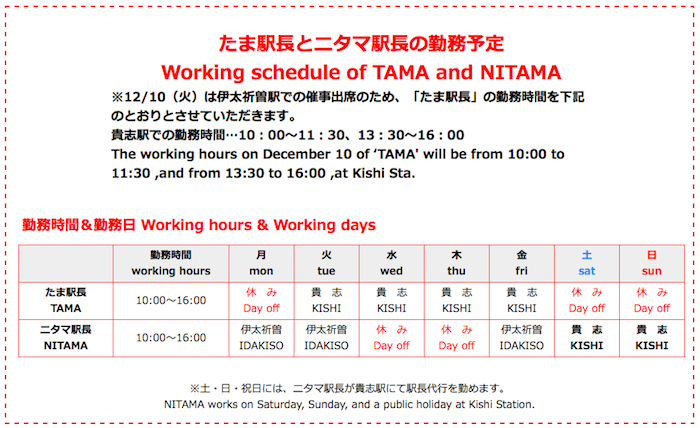 แต่ถ้าไปแล้วหาเจ้าทามะไม่เจอ แสดงว่าคุณพลาดแล้วล่ะครับ เพราะเจ้าทามะเป็นพนักงานประจำ มีวันทำงาน ก็ต้องมีวันหยุดครับ เพราะฉะนั้นจะไป ต้องเลือกวันเลือกเวลาด้วย ไปแล้วไม่เจอเสียดายแย่ (เจ้านิตามะคือเหมียวอีกตัว เป็นนายสถานีเหมือนกันครับ)