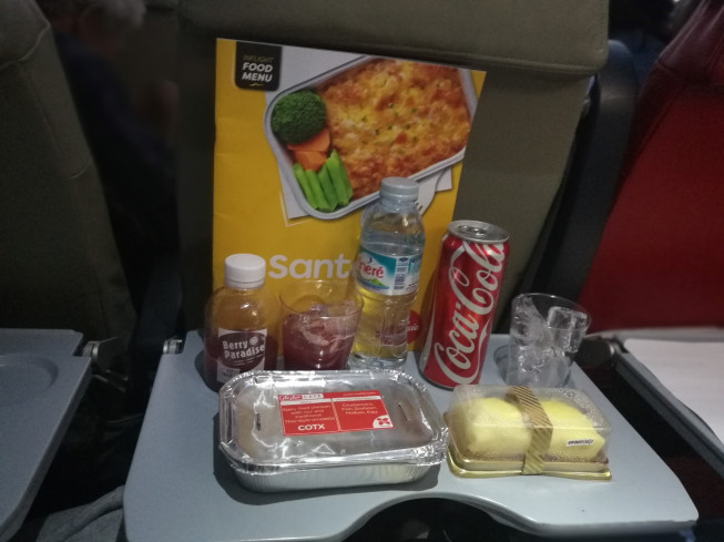 เราไม่ได้ทานอาหารกลางวันกันมา มีแค่ขนมรองท้องจากเลาจน์ เพราะเราสั่งอาหารล่วงหน้ามาทานบนเครื่องแล้ว แถมวันนี้เรามีเมนูในใจที่อยากจะกินมาก คือ เครปมะม่วง เมนูในตำนานของแอร์เอเชียในช่วงนี้ครับ แนะนำให้ลอง อร่อยจริงๆ