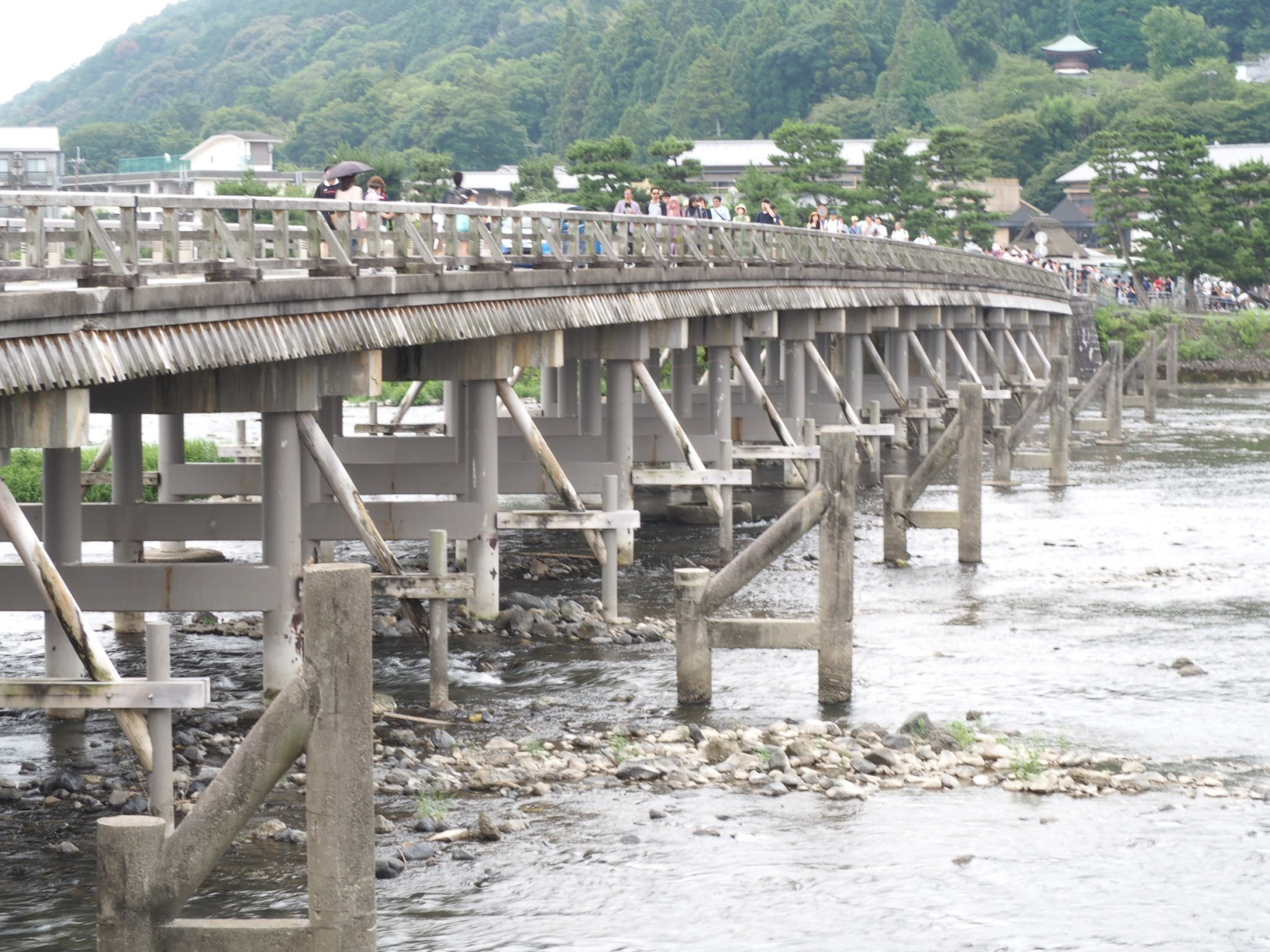 เราใช้วิธีการเดินจากโรงแรม ไปยังสถานที่ต่างๆ ที่ดูเหมือนจะไกล แต่จริงๆ ไม่ไกลมากครับ พอเดินไปได้ชิวๆ ดังนั้นสถานที่แรก เราจึงเดินผ่าน สะพานโทเง็ตสึเคียว (Togetsukyo Bridge) หรือบางทีเรียกว่า สะพานข้ามจันทร์ “Moon Crossing Bridge”
