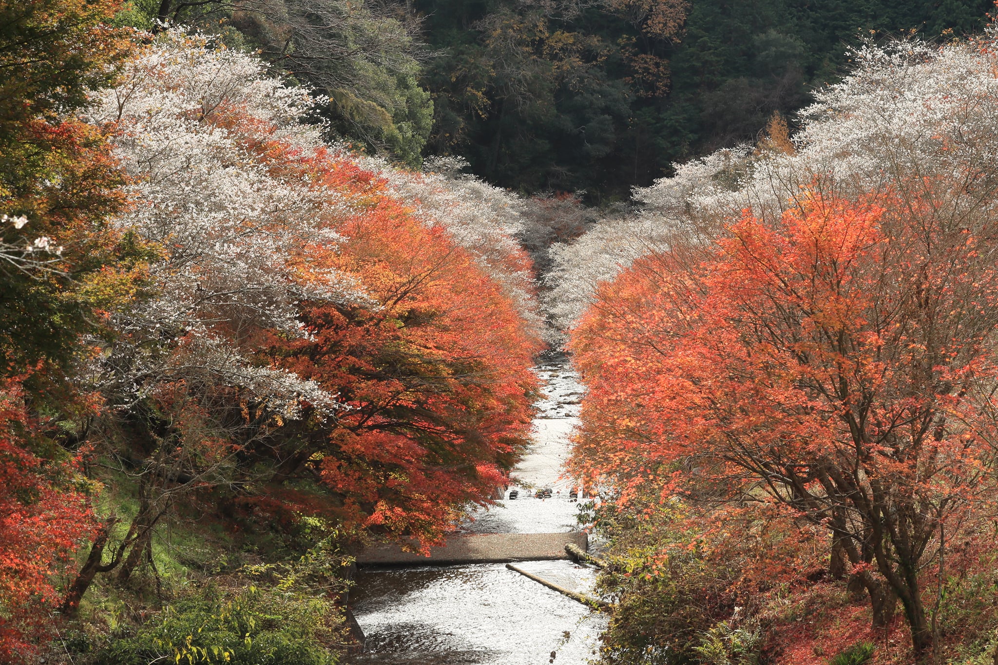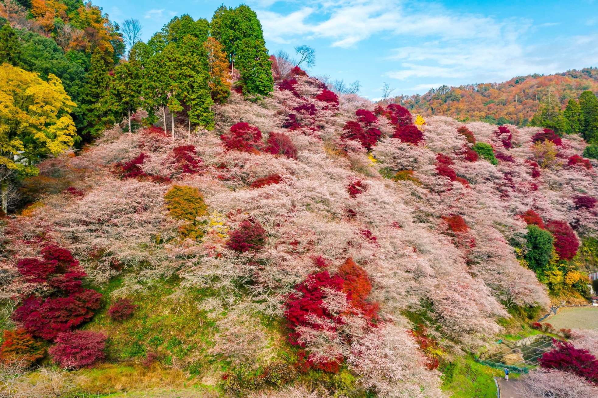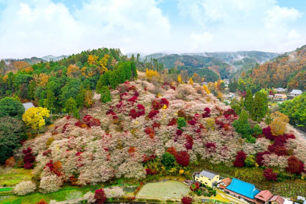 เซนมิ ชิกิซากุระ โนะ ซาโตะ บริเวณพื้นที่ลาดชันของภูเขาถูกปกคลุ่มไปทั่วด้วยต้นไม้กว่า 1,200 ต้น ทำให้สามารถชม ความงามของใบไม้เปลี่ยนสีและชิกิซากุระได้ในคราวเดียวกัน ยามลมพัดจะเกิดเป็นแนวคลื่นของซากุระและใบไม้เปลี่ยนสีพลิ้วไหวไปตามลม ยิ่งทำให้งดงามจับใจ อีกทั้งบริเวณปลายน้ำด้านล่าง ยังมี เส้นทางคาคิกาอิริ (Kakigairi Stroll Path) ที่มีทั้งใบไม้เปลี่ยนสีและชิกิซากุระตลอด 2 ฝั่งแม่น้ำ เหมาะสำหรับเดินเล่นพักผ่อนหย่อนใจอย่างยิ่ง