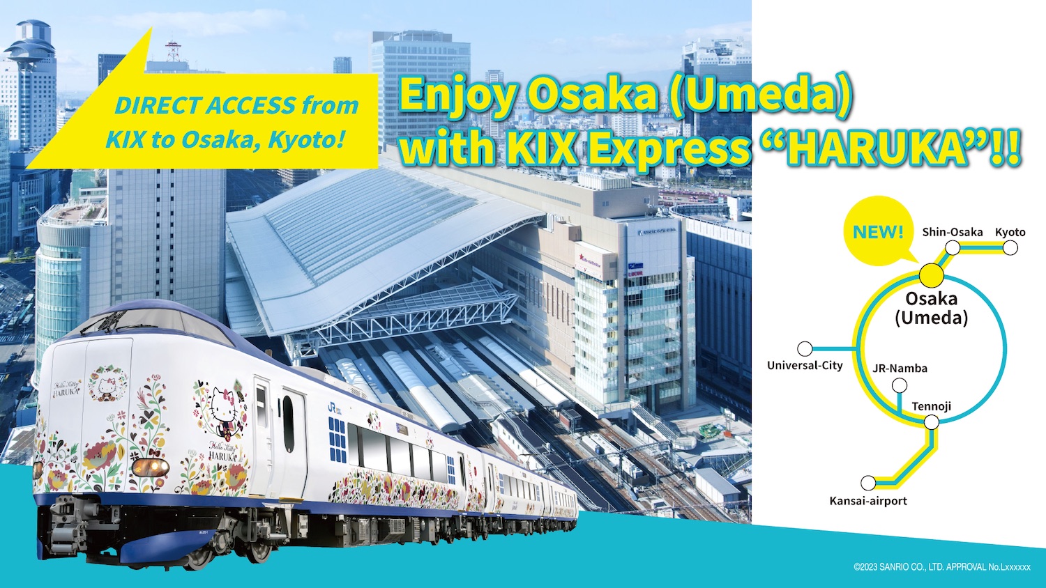 รถไฟขบวน Kansai Airport Limited Express Haruka จะวิ่งตรงจากสนามบินคันไซ มุ่งหน้าไปยังตัวเมืองโอซาก้า และ เกียวโตได้ โดยจะแวะจอดทั้งหมด 4 สถานี คือ Tennoji (35 นาที), Osaka (45 นาที), Shin-Osaka (50 นาที) และสุดสายที่สถานี Kyoto (1 ชั่วโมง 20 นาที)
