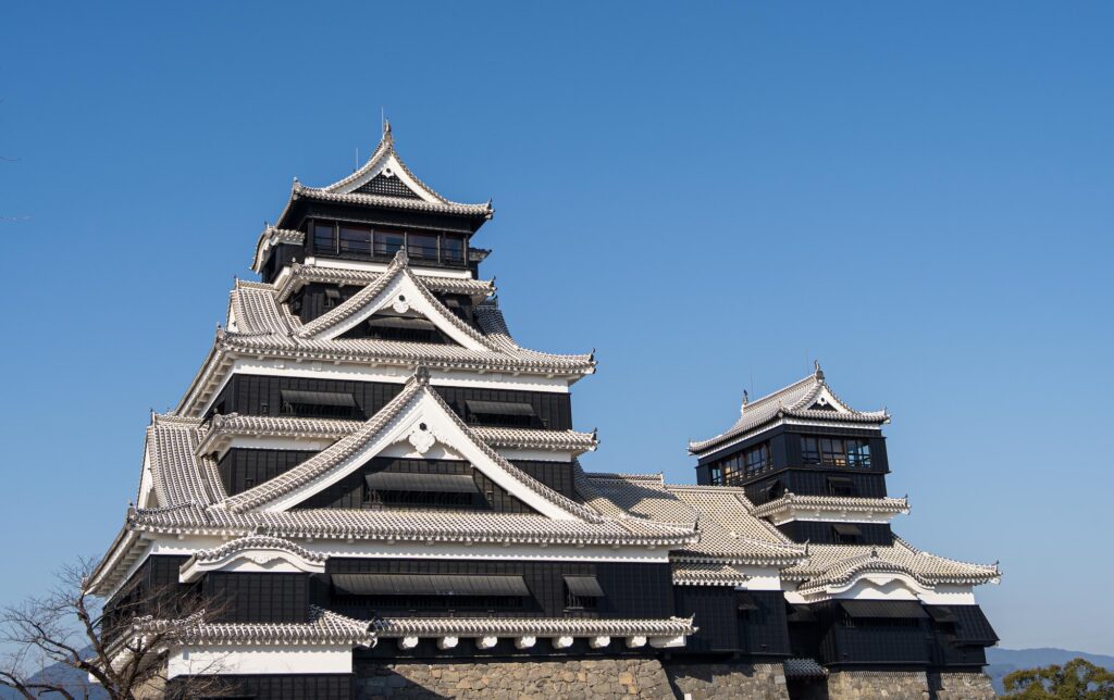 ปราสาทคุมาโมโตะ (Kumamoto Castle) ที่มีความยิ่งใหญ่เป็นอันดับต้นของญี่ปุ่น มีประวัติศาสตร์กว่า 400 ปี โดยตัวปราสาทจะออกโทนขาวเทาดำ มีสวนรอบปราสาทที่ช่วงฤดูใบไม้ผลินี่ถือว่าเป็นอีกหนึ่งจุดยอดนิยมในการชมซากุระของเมือง และล่าสุดตัวปราสาทได้ทำการบูรณะเสร็จสิ้นแล้วจากเหตุการแผ่นดินไหวในปี 2016