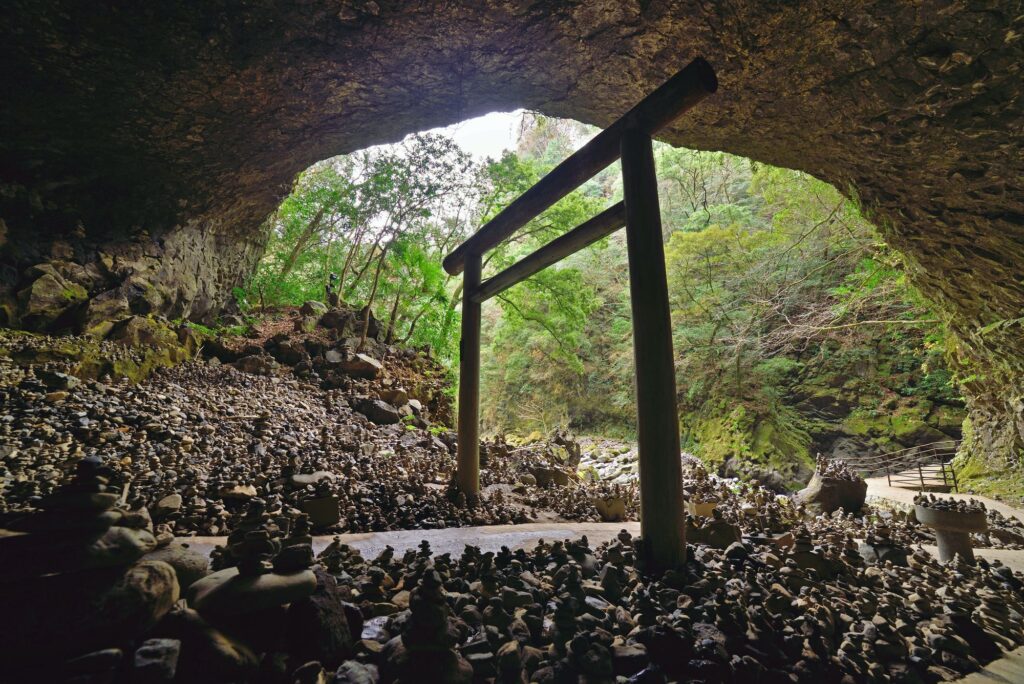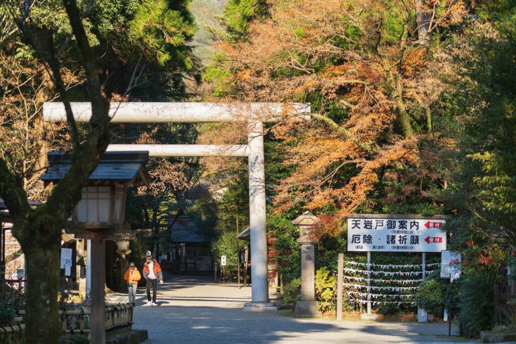 ศาลเจ้าอามาโนะอิวาโตะ (Amanoiwato) เป็นสถานที่ที่เหล่าเทพมาประชุมวางแผนล่อเทพอามะเทราสุออกจากถ้ำ เพื่อคืนความสว่างในโลก จากศาลเจ้าเดินลงเขาไป 10 นาทีจะเจอถ้ำอามาดนะยาสุคาวาระ (Amanoyasukawara) ที่เป็น Power Spot สำหรับมารับพลัง เมื่อเดินเข้าถึงปากถ้ำจะมองเห็นกองหินเรียงกันจำนวนมาก ผู้คนที่มาที่นี่ต่างมาขอพรโดยการเรียงหินเป็นเลขคี่ เชื่อกันว่าถ้าเรียงให้ตั้งได้จะสมหวังตามที่ขอ