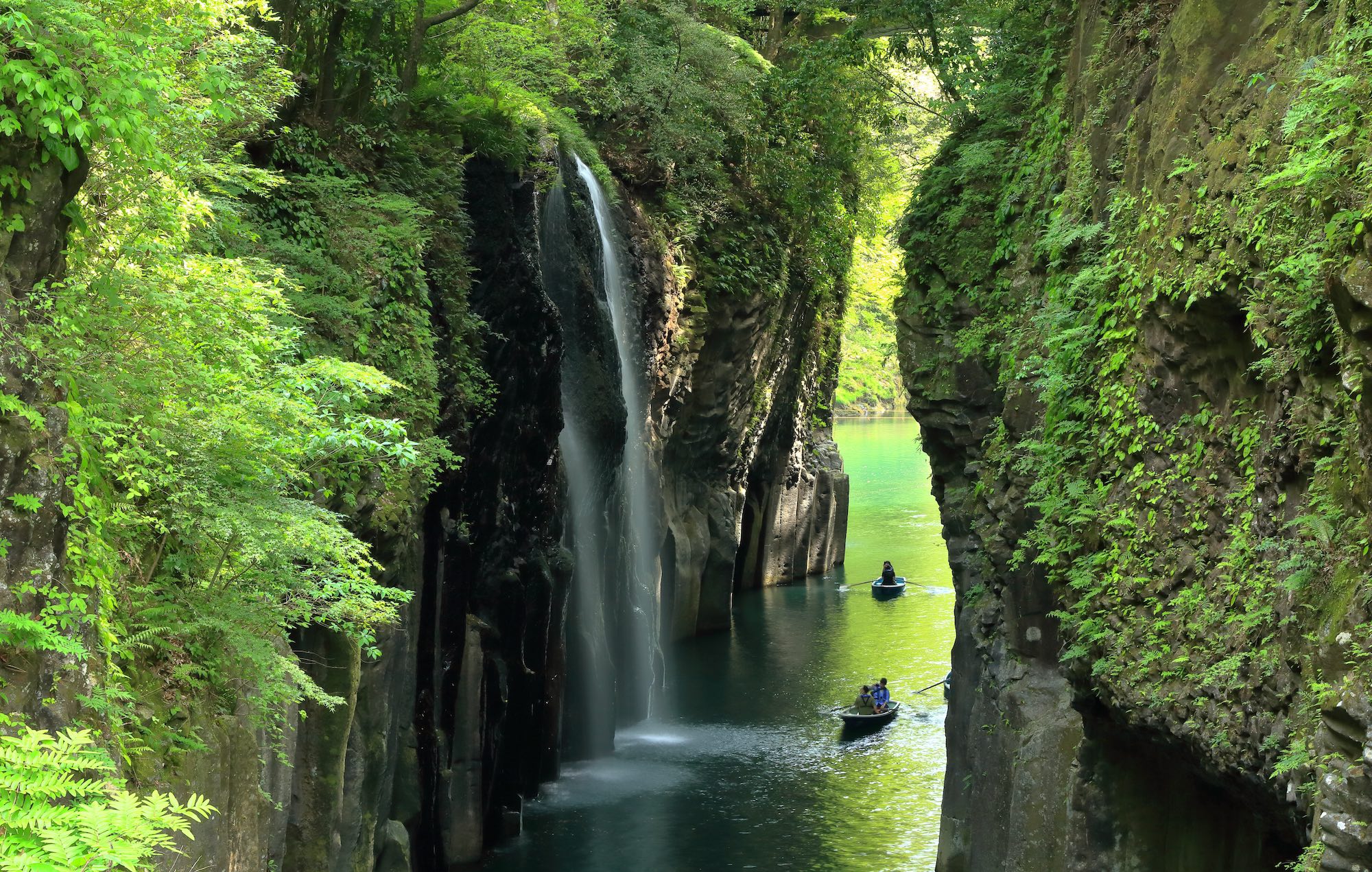 หุบเขาทาคาจิโฮะ (Takachiho Gorge) สถานที่ท่องเที่ยวทางธรรมชาติในจังหวัดมิยาซากิมีแม่น้ำโกคัสเซะ (Gokasse) ไหลผ่านกลางหุบเขาขนาบอยู่สองข้างทาง หุบเขาแห่งนี้เกิดจากหินลาวาที่หลอมละลายจากการปะทุของภูเขาไฟอะโซ แล้วกัดเซาะจนเกิดเป็นช่องหินที่สวยแปลกตา แวดล้อมไปด้วยทัศนียภาพสุดร่มรื่นของน้ำตกมานาอิ (Manai no Taki) การพายเรือชมบรรยากาศสวยๆ ทำให้เห็นถึงความมหัศจรรย์ของธรรมชาติที่ได้รังสรรค์ขึ้นมาได้อย่างใกล้ชิด