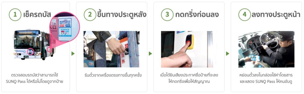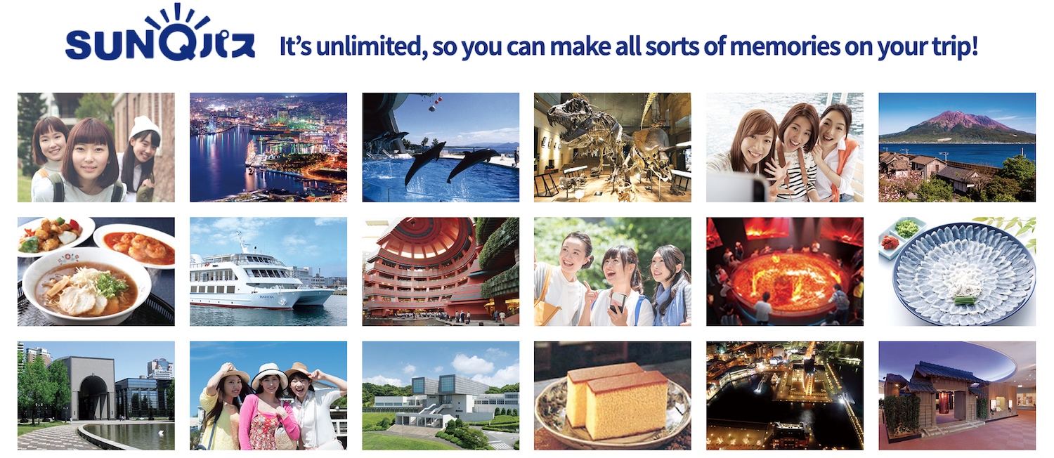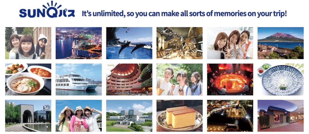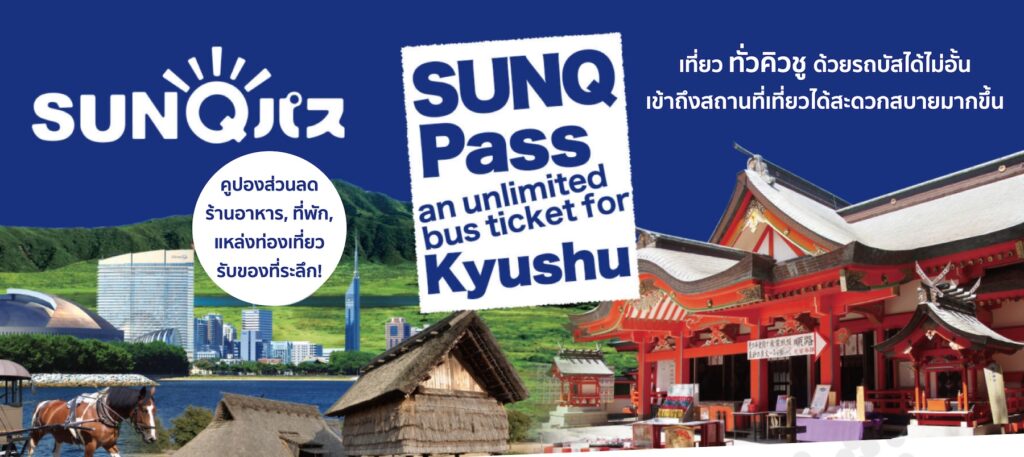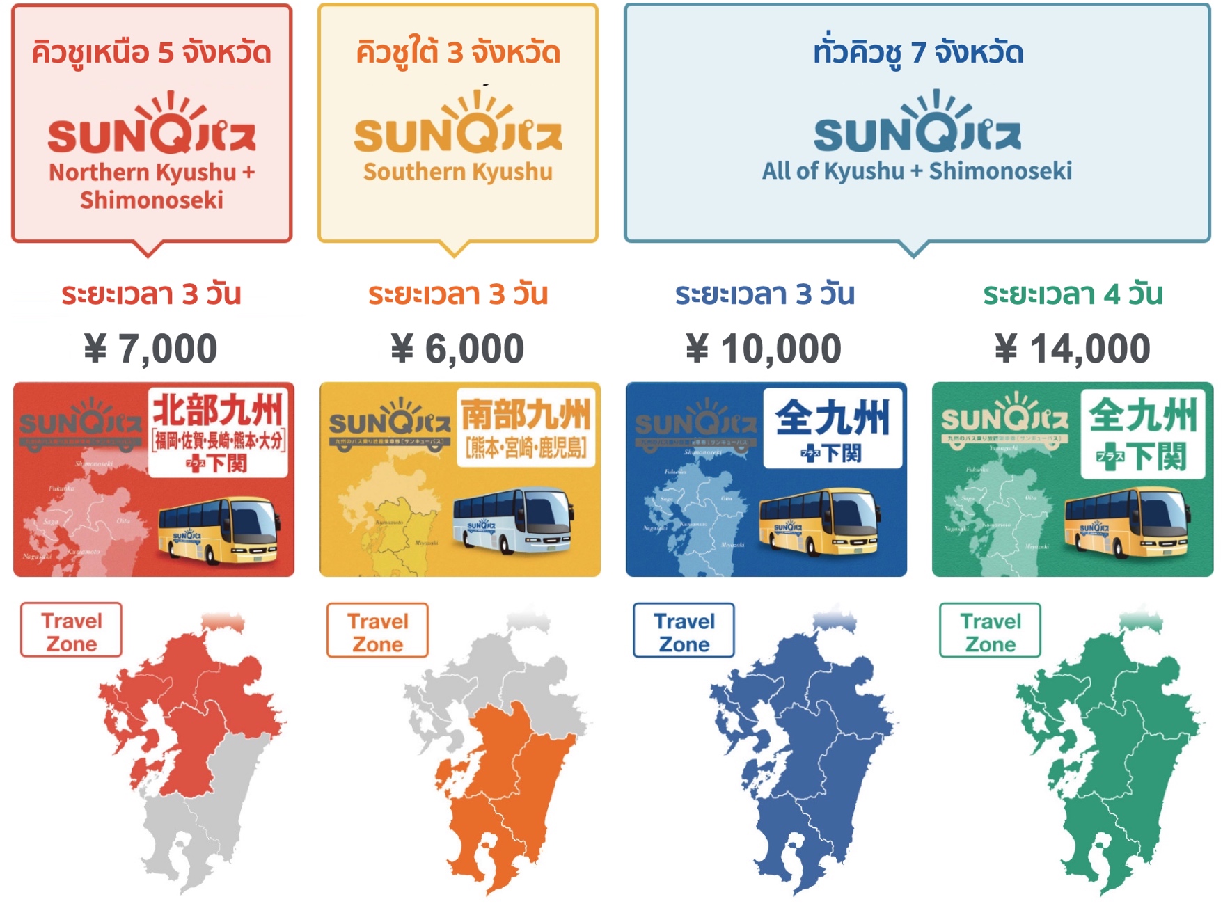 SUNQ Pass เป็นพาสที่สามารถใช้เที่ยวคิวชูด้วยรถบัสทุกประเภทได้ไม่จำกัด ไม่ว่าจะเป็น รถบัสระหว่างเมือง รถบัสภายในเมือง รวมถึงขึ้นเรือเฟอร์รี่ได้ นอกจากนี้ยังสามารถใช้เดินทางไปฝั่งชิโมโนเซกิ จังหวัดยามากุจิ ที่อยู่ติดกับเกาะคิวชูได้อีกด้วย