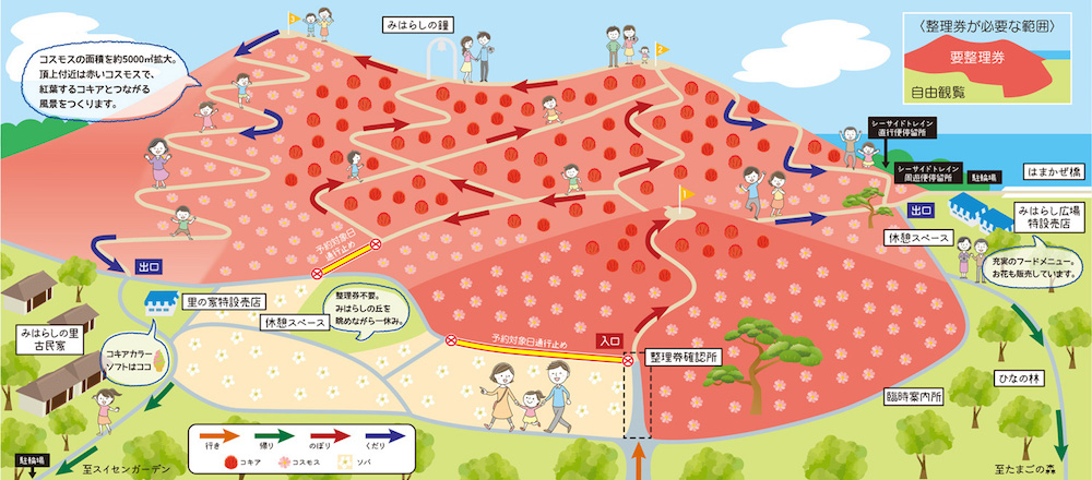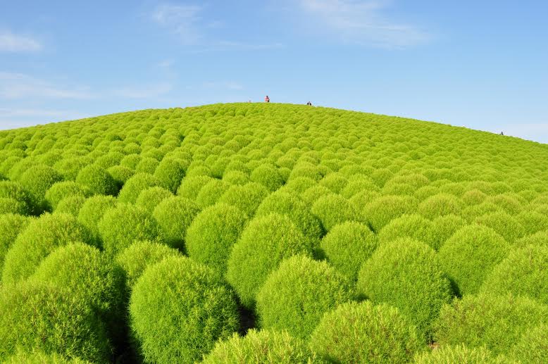 โดยเฉพาะที่ “มิฮาราชิ โนะโอกะ” ซึ่งมีพุ่มโคเคียใบสีเขียวอ่อนแสนสดชื่นในช่วงฤดูร้อน และจะค่อยๆเปลี่ยนเป็นสีส้ม และสีแดงสดในช่วงต้นเดือนไปจนถึงกลางเดือนตุลาคม ซึ่งท่านจะสามารถเห็นเป็นวิวเนินเขาไล่เฉดสี ตัดกับสีฟ้าของท้องฟ้าสดใส นอกจากนั้น ยังมีช่วงหลังฤดูใบไม้ร่วง ซึ่งพุ่มโคเคียจะเปลี่ยนเป็นสีน้ำตาลเป็นสีเหลืองทอง ซึ่งน่าดูชมเช่นกัน