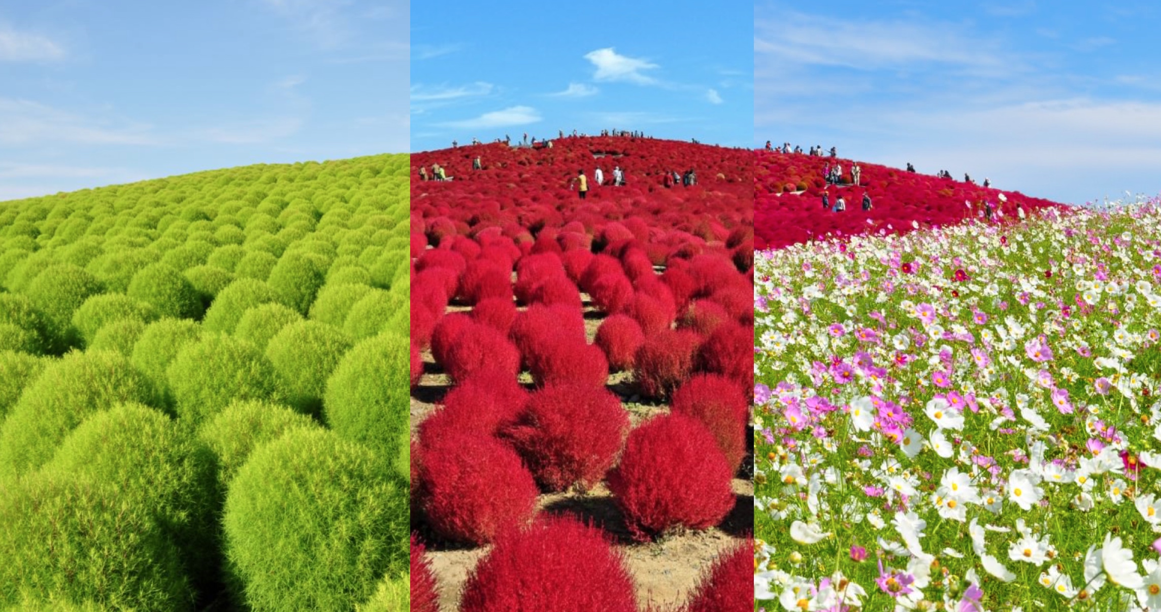 กลางตุลาคม : พุ่มโคเคียเปลี่ยนสี แต่งแต้มเนินเขาให้เป็นสีแดงสด จะพบพุ่มโคเคียที่ย้อมสีแดงไปทั่ว ส่วนปลายเนินเขาคุณจะพบดอกคอสมอส (ดอกดาวกระจาย) ลู่ลมฤดูใบไม้ร่วง ช่วยแต่งแต้มสีสันของฤดูใบไม้ร่วงไปพร้อมกับพุ่มโคเคีย