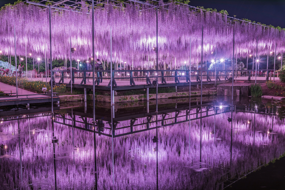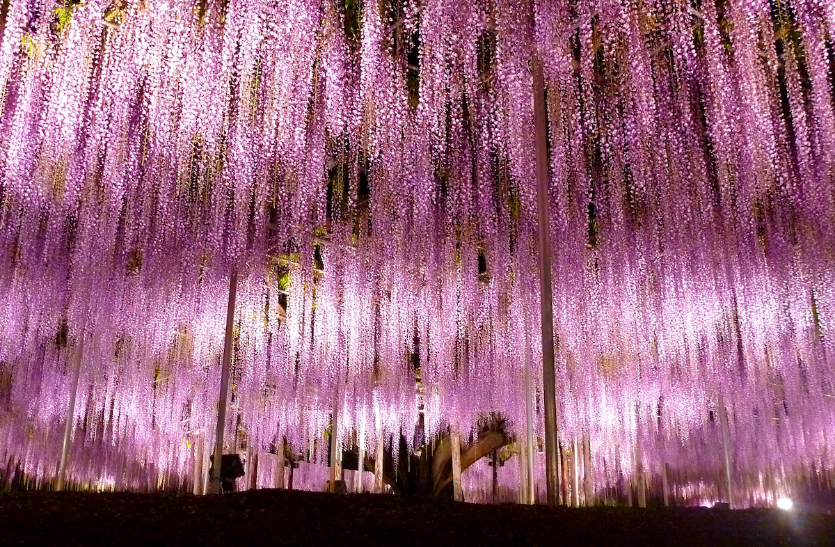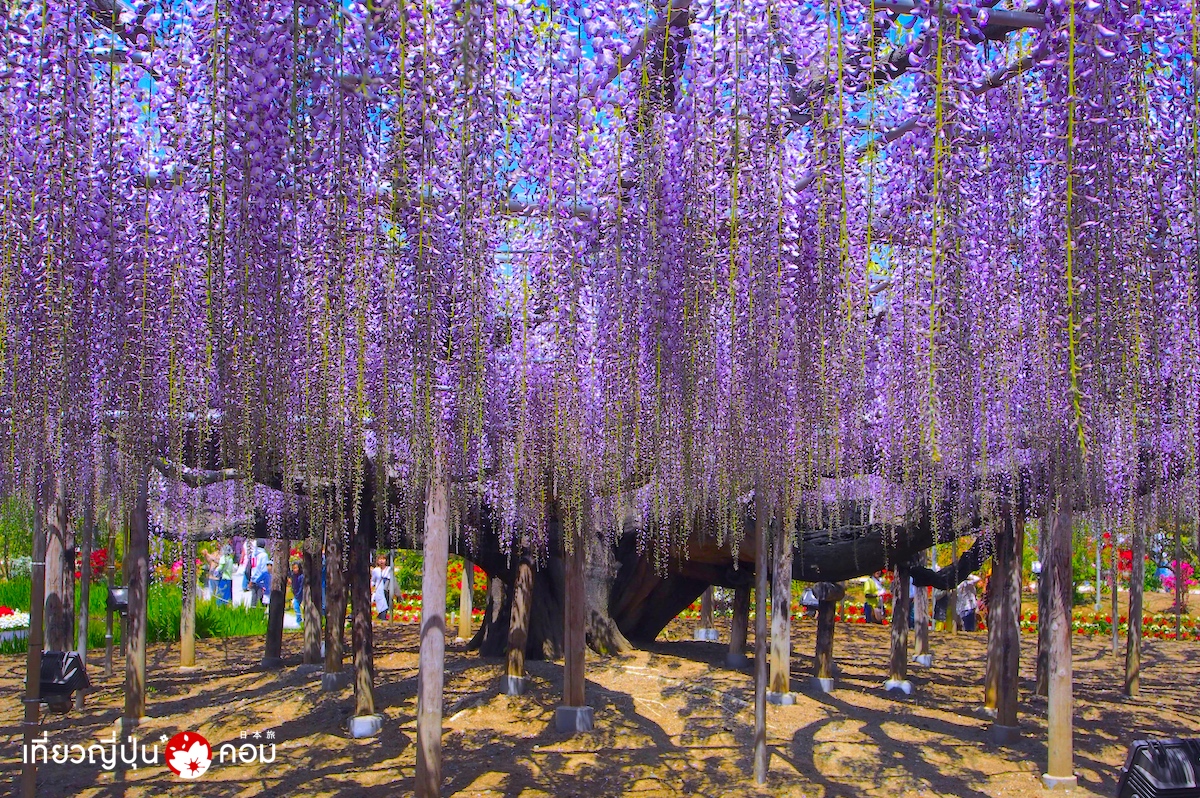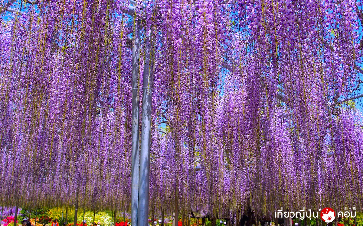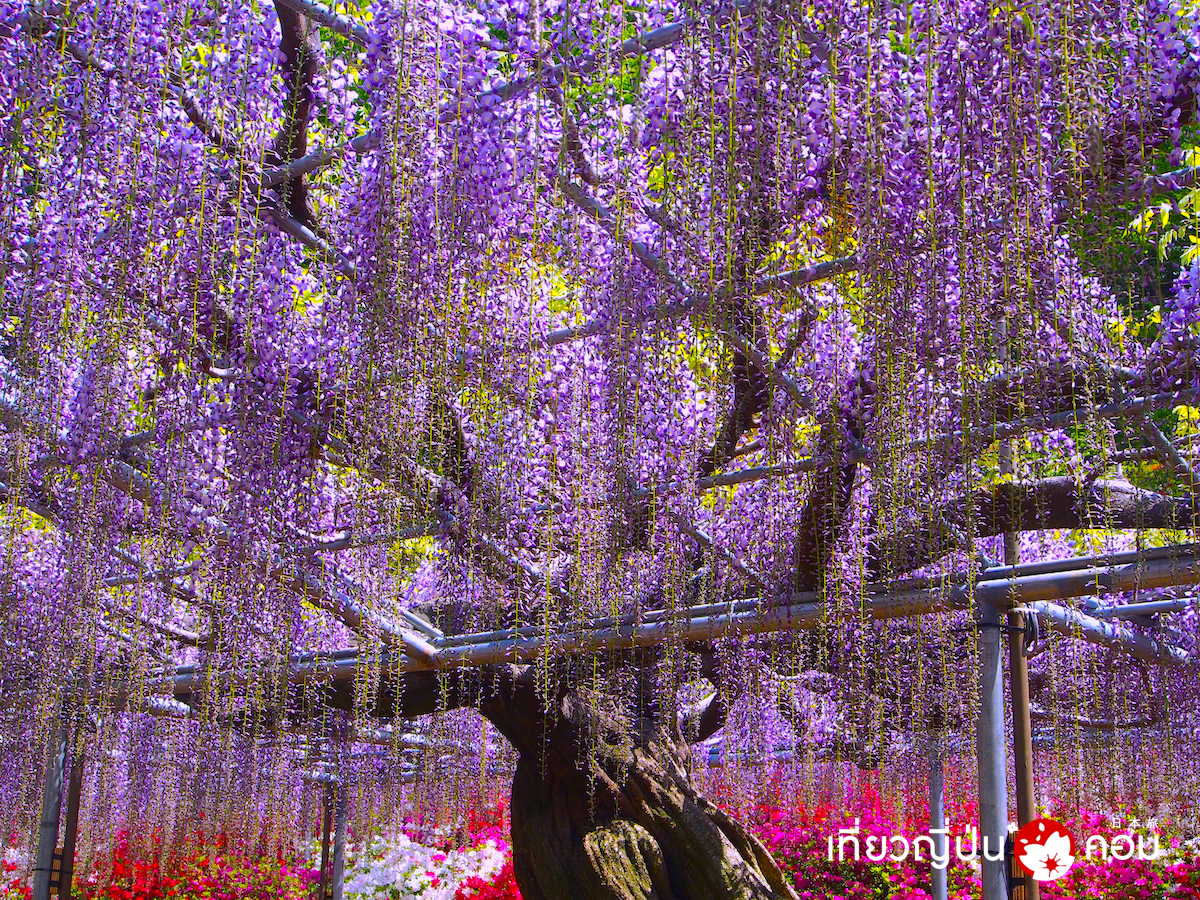 ต้น Wisteria ที่สวนแห่งนี้ออกดอกห้อยตกลงมาเป็นระย้าราวกับน้ำตกสีม่วง กระจายอาณาเขตวงกว้างครอบคลุมพื้นที่กว่า 1,000 ตร.ม. โดยต้นที่ใหญ่ที่สุดมีอายุเก่าแก่กว่า 150 ปี มีอุโมงค์ดอก Wisteria สีขาวและเหลือเป็นระยะทางยาวกว่า 80 เมตร นอกจากนี้ช่วงเวลาลางวันเราจะได้เห็นดอก Wistria สะท้อนกับน้ำในบ่อ เป็นอีกภาพที่สวยงามน่าประทับใจ