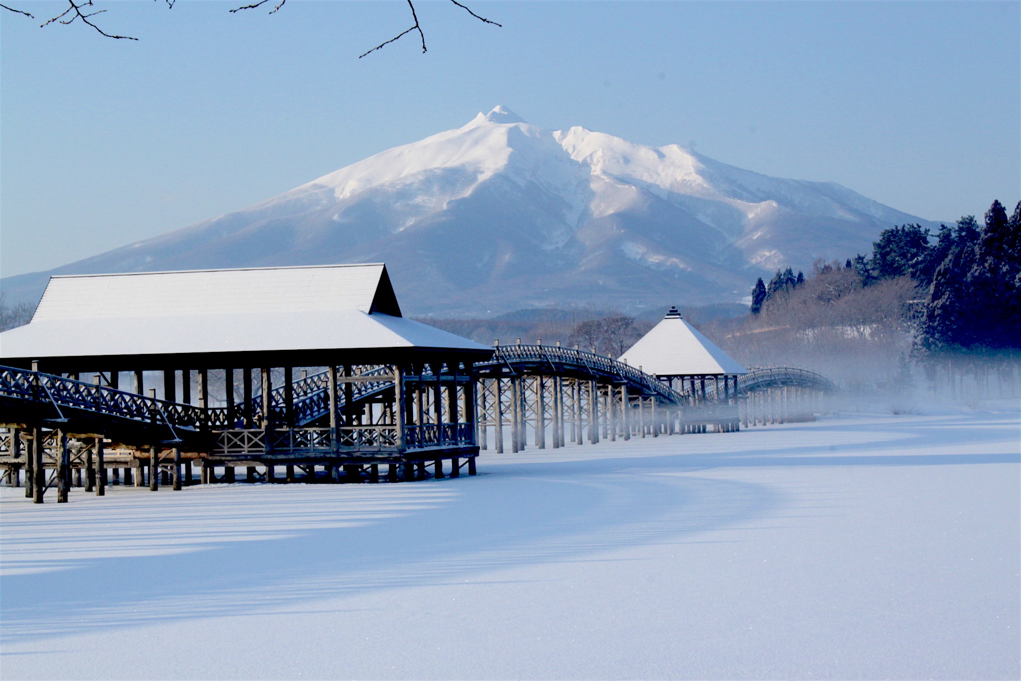 ในฤดูหนาวถึงแม้สะพานจะปิดไม่ให้เดินข้าม แต่ยังสามารถชมทิวทัศน์อันสวยงามจากจุดที่ห่างออกไปอีกเล็กน้อยได้ ภาพของเงาของสะพานและภูเขาที่มีหิมะสีขาวปกคลุมสะท้อนบนผิวน้ำในทะเลสาบมีความสวยงามเป็นอย่างมาก และหาชมได้แค่ในฤดูนี้เท่านั้น เรียกได้ว่าต้องมาเช็กอินถ่ายรูปที่นี่สักครั้ง รับรองว่าใครเห็นก็ต้องร้องว้าว