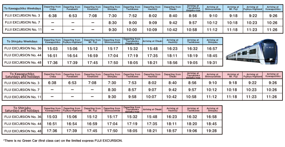 - Fuji Excursion 78 (ขากลับ) ออกจากสถานี Kawaguchiko เวลา 16.25 น. ถึงสถานี Shinjuku เวลา 18.27 น.