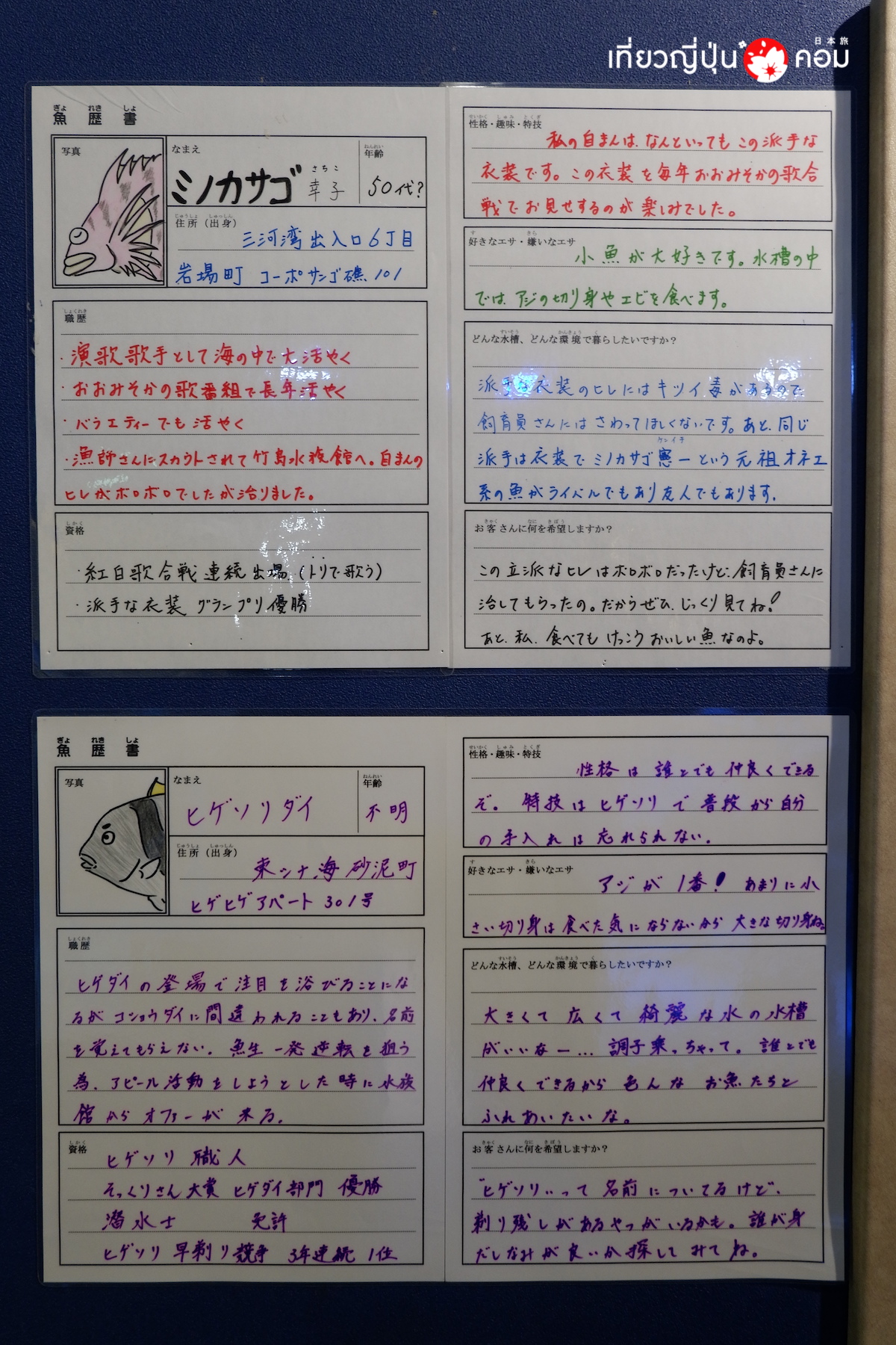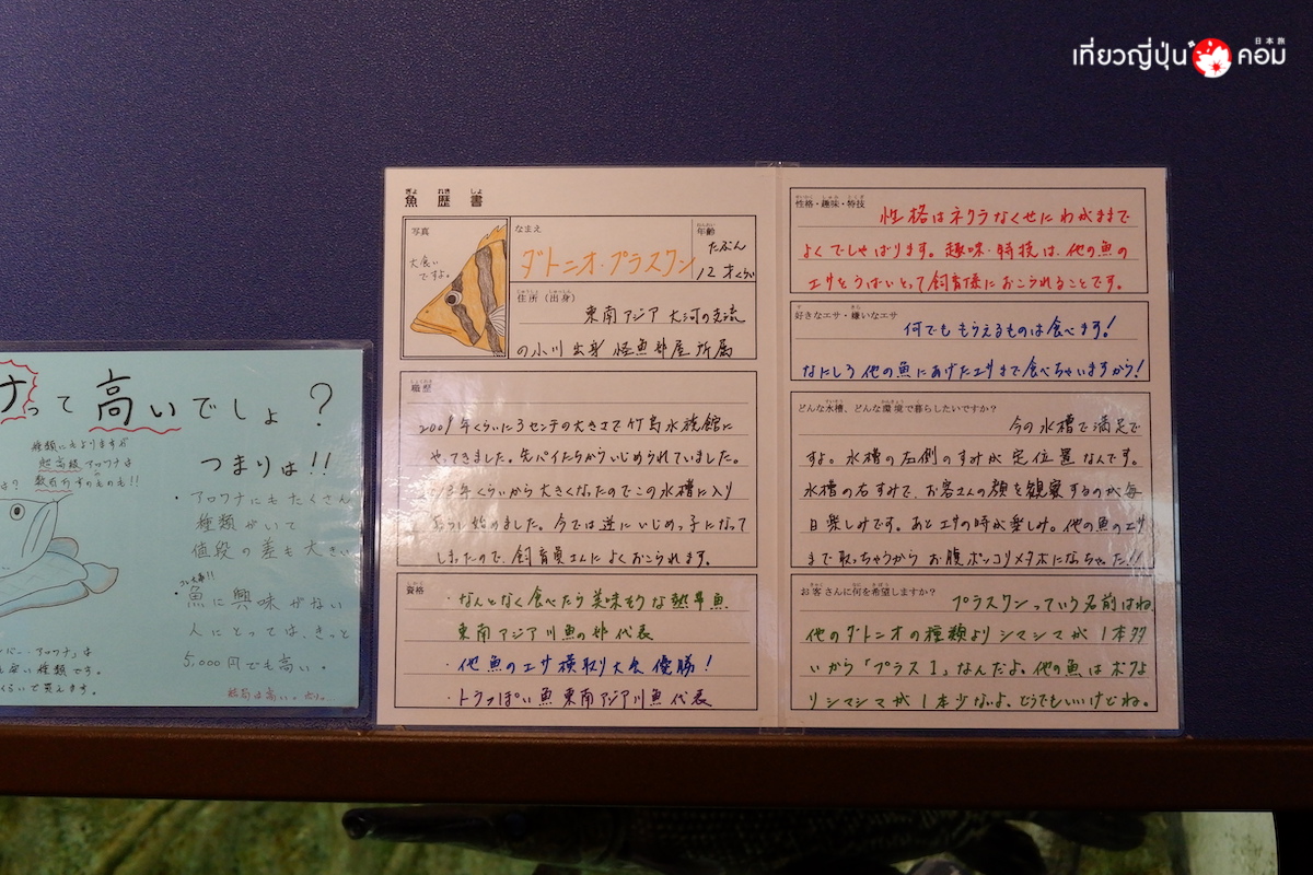 ความพิเศษของที่นี่คือความน่ารักสไตล์ญี่ปุ่น ที่บรรดาผู้ดูแลสัตว์เลี้ยงจะเขียนอธิบายข้อมูลของสัตว์แต่ละชนิดเป็นตัวหนังสือลายมือ พร้อมบอกความประทับใจของตนเองที่มีต่อสัตว์ในความดูแลอีกด้วย โดยข้อความส่วนใหญ่จะเป็นการเขียนบอกเล่าถึงตัวสัตว์เลี้ยง อาทิเช่น ชื่อ สายพันธุ์ แหล่งที่มา อาศัยอยู่ที่นี่มานานเท่าไหร่แล้วเป็นต้น