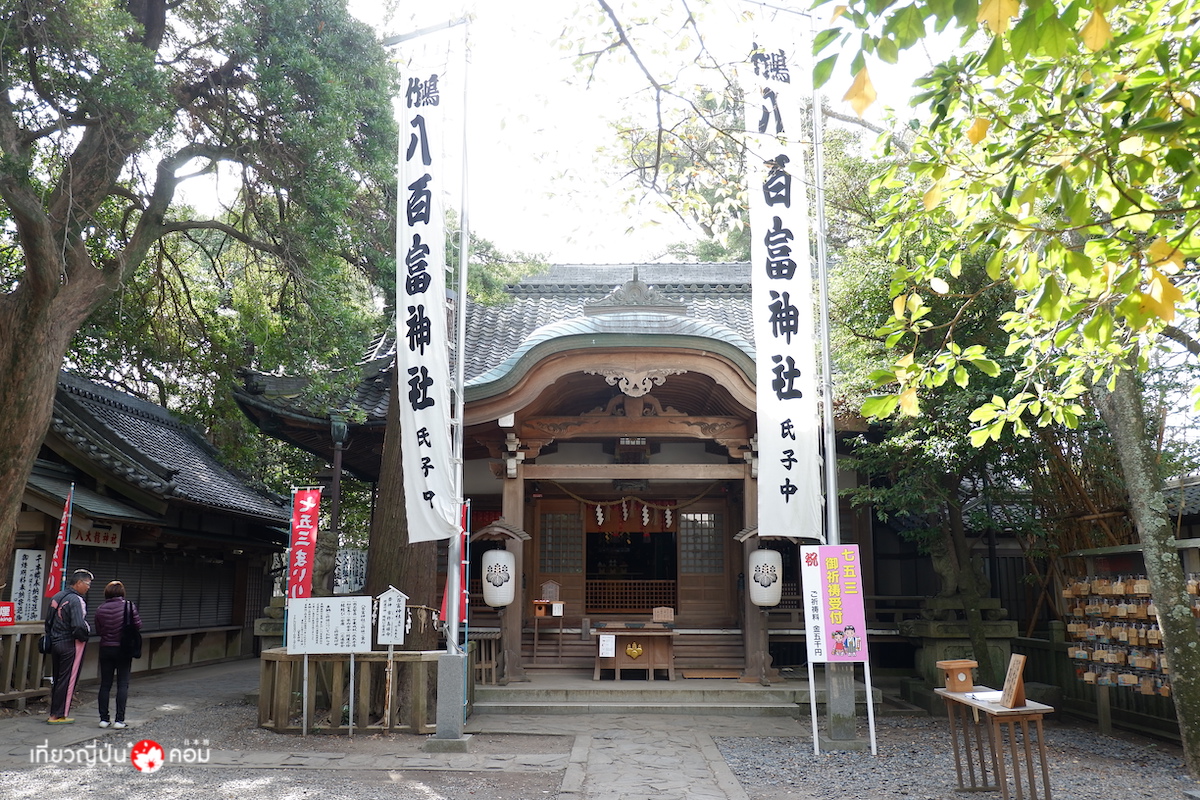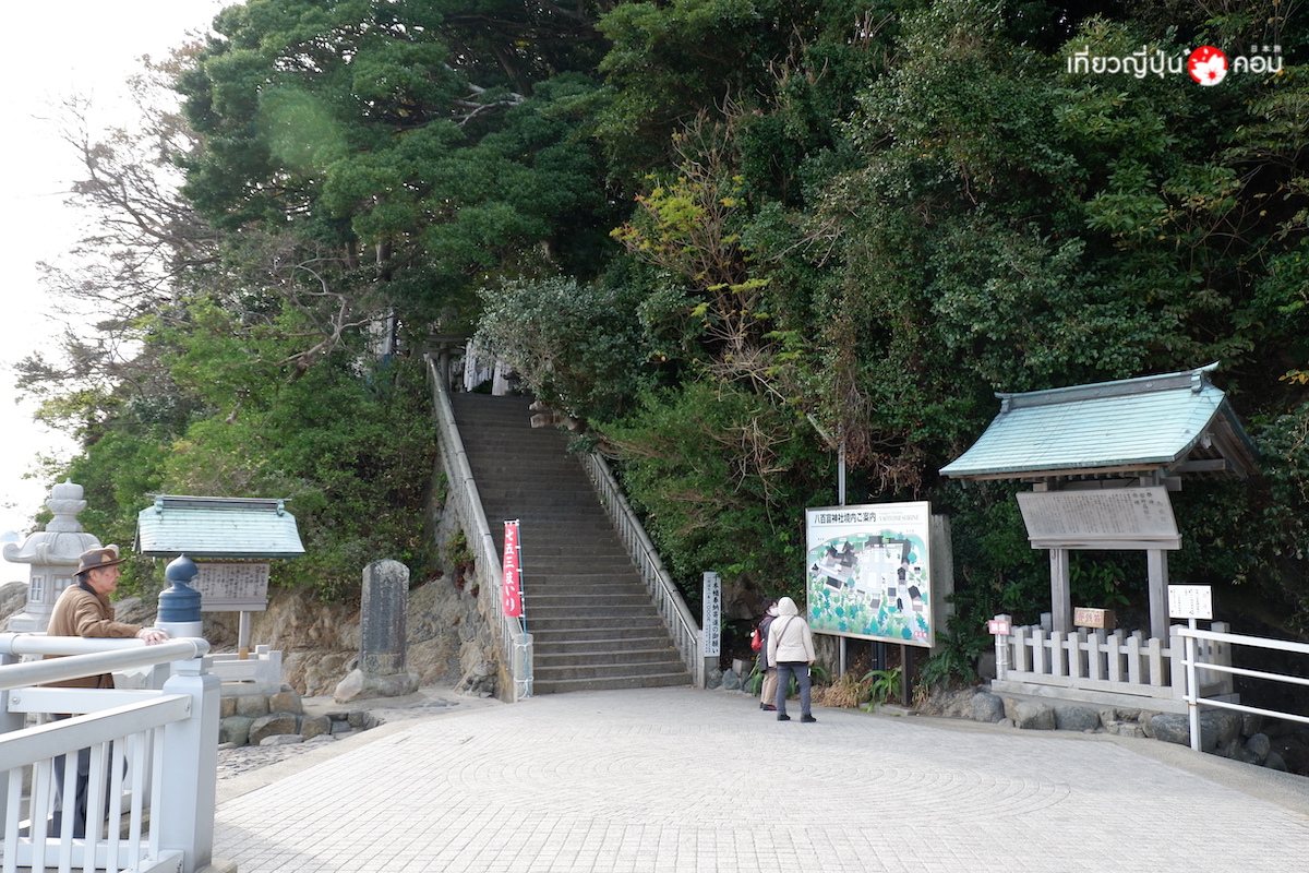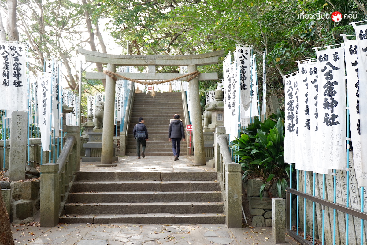นอกจากความสวยงามของทิวทัศน์ท้องทะเลแล้ว เมื่อเดินทางมายังเกาะทาเคชิมะ อย่าลืมไปสักการะศาลเจ้า Yaotomi Jinja ซึ่งตั้งอยู่ด้านบนของเกาะ โด่งดังในเรื่องของการขอพรความรักและคลอดลูกอย่างปลอดภัย ต้องเดินขึ้นบันไดกว่า 121 ขั้นสู่ตัวศาลเจ้าด้านบน