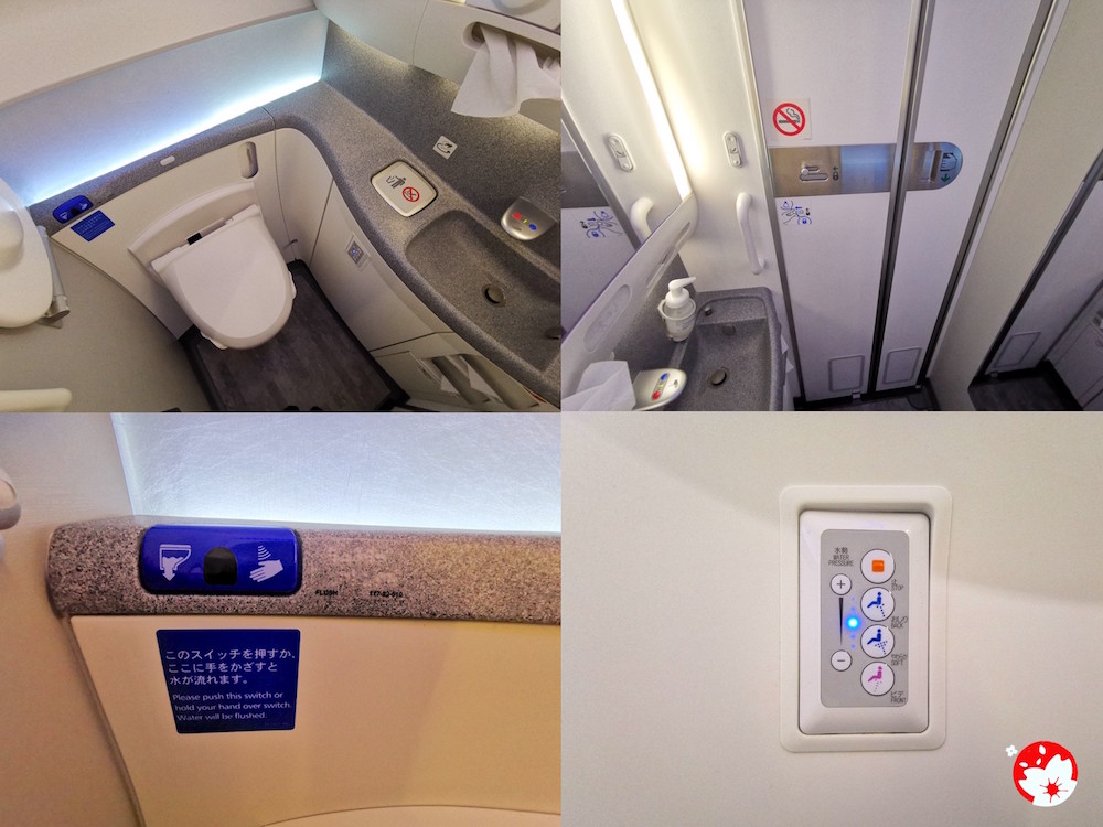 ห้องน้ำบนเครื่องก็กว้างขวาง มีปุ่มทำความสะอาดอัตโนมัติ ตามสไตล์ญี่ปุ่นให้ด้วย ใส่ใจทุกรายละเอียดจริงๆ