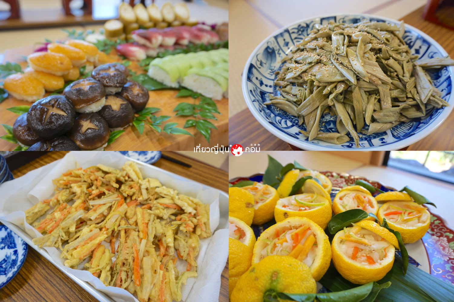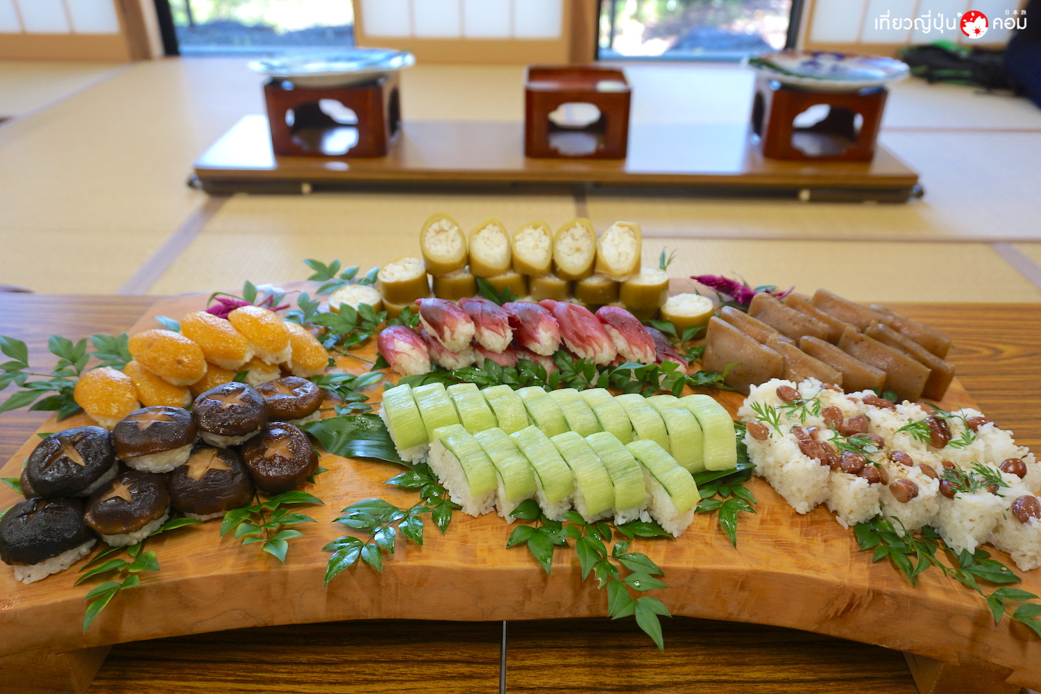 โดยจะใช้น้ำส้มสายชูที่หมักจากส้มยูซุ มาผสมลงในข้าวซูชิ จนออกรสชาติเปรี้ยวและหอมกลิ่นส้มยูซุ นำมาปั้นเป็นก้อนและโปะหน้าด้วยผักภูเขาต่างๆ อาทิ หน่อไม้ หัวมัน เห็ดหอม ขิงญี่ปุ่น มีสีสันสวยงาม หน้าตาน่ารับประทาน