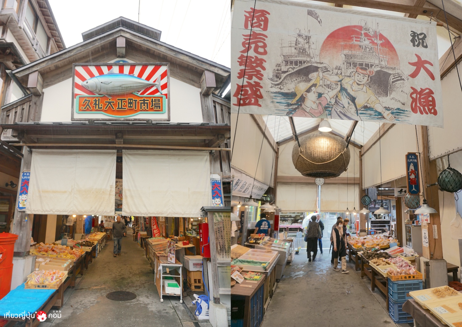 สถานที่ที่ถ้ามาที่เมืองนี้แล้ว ไม่แวะมาไม่ได้ นั่นก็คือ ตลาดเมืองคุเระไทโช (Kure Taishomachi Ichiba) เป็นย่านการค้าเก่าแก่ และเป็นห้องครัวประจำเมือง อยู่คู่กับชาวเมืองมานานนับร้อยปี โดยในตรอกเล็กๆที่เรียงรายด้วยร้านค้าและแผงลอย ชาวบ้านจะนำอาหารทะเลสดๆมาให้เลือกซื้อกันแต่เช้า จะเลือกทานอาหารทะเลสดแบบทั้งตัว ไปปรุงเองที่บ้าน หรือเลือกซื้อแบบแบ่งขาย และทานเป็นซาชิมิสดๆในตลาดก็ได้เช่นกัน