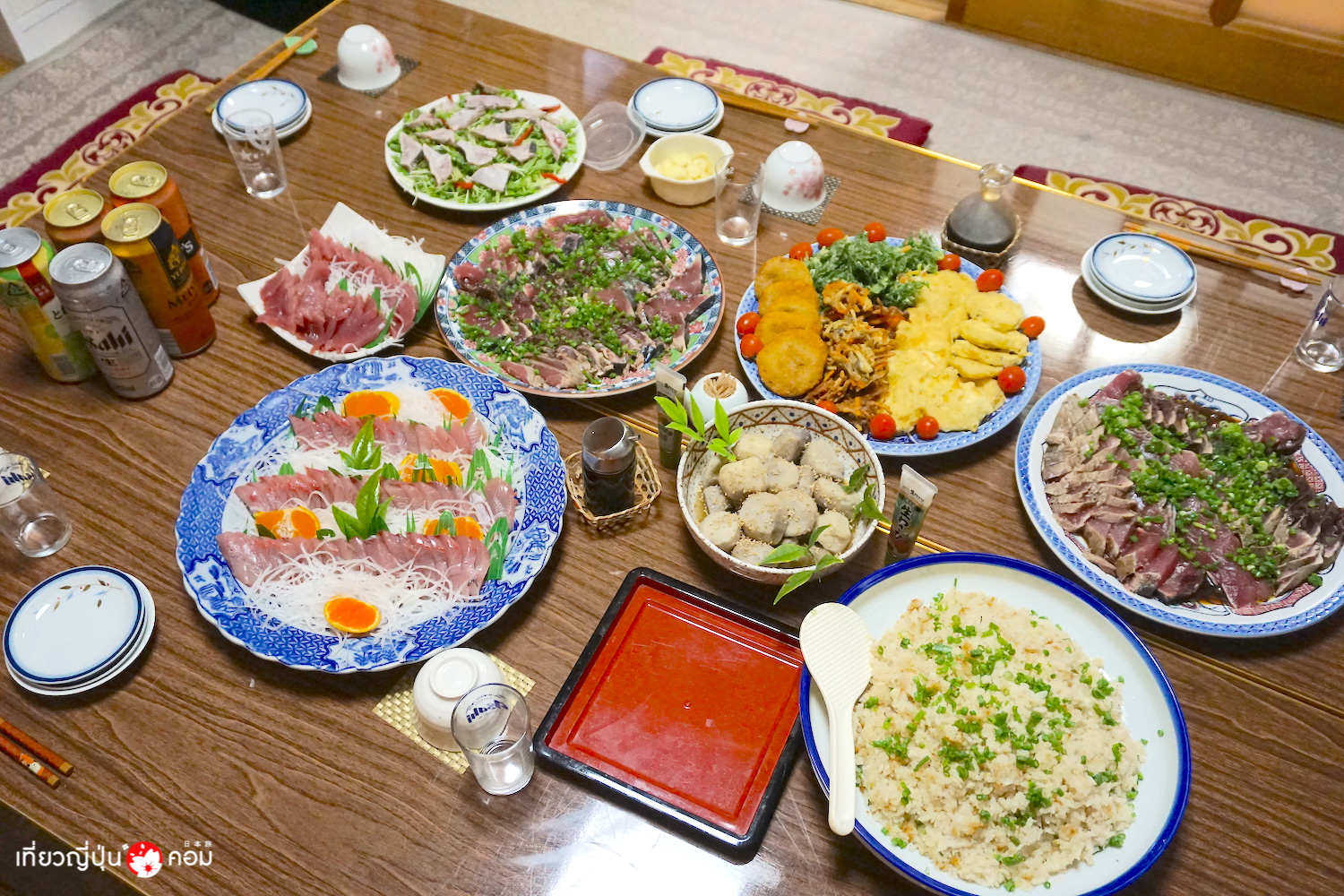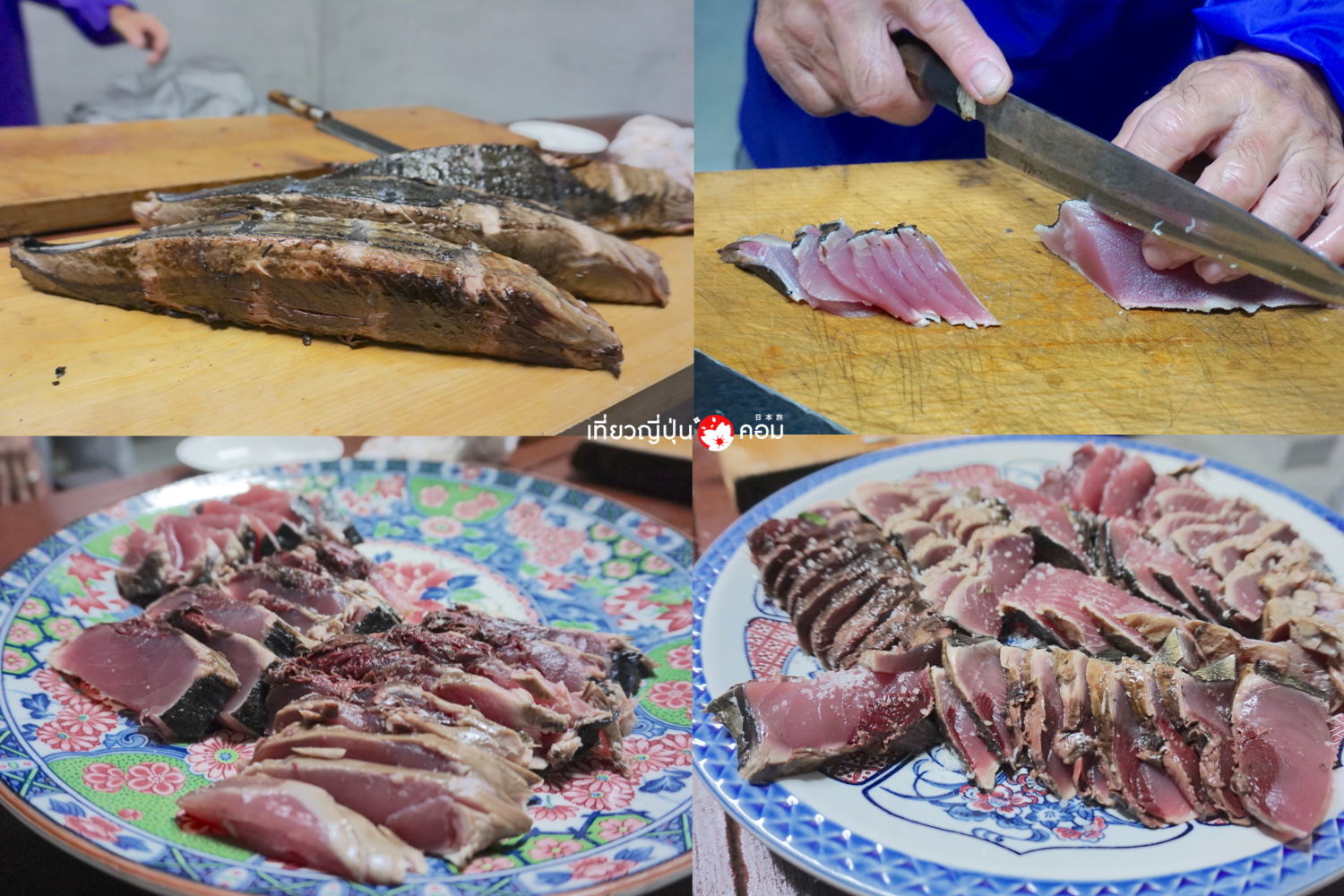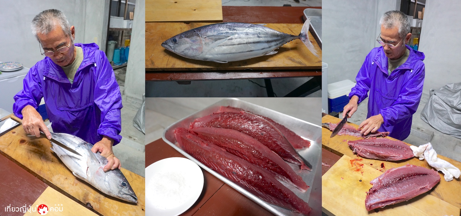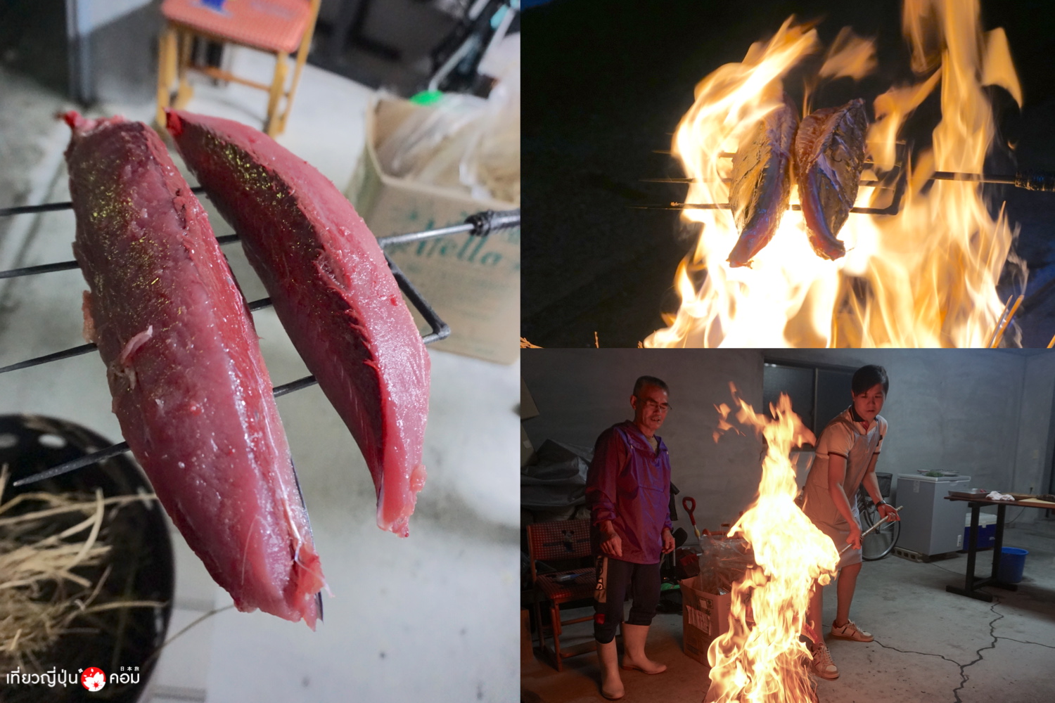 ประสบการ์ณสุดพิเศษสำหรับค่ำคืนนี้คือการย่างปลาคัทสึโอะ ซึ่งก่อนอื่น โอโต้ซังจะนำปลาคัทสึโอะตัวใหญ่ทั้งหนาทั้งแน่น ที่เลือกมาอย่างดี สำหรับการปรุงอาหารมื้อเย็นวันนี้ จัดการแล่ให้เราดู และให้เราได้ลองสัมผัสความรู้สึกตอนที่มีดคมๆ ผ่าเข้าไปในเนื้อแน่นๆของเจ้าปลาอีกด้วย
