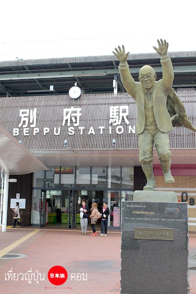 ก่อนไปขึ้นรถบัส ที่ด้านหน้าสถานีเราจะเห็นรูปปั้นคุณลุงท่าทางอารมณ์ดีมีชื่อเรียกว่า Pika Pika Oji san หรือ คุณลุงปิ๊งปิ๊ง แปลมาจากภาษาอังกฤษว่า Shiny Uncle ซึ่งคุณลุงเป็นบุคคลที่มีความสำคัญในด้านของการท่องเที่ยวของเบปปุเป็นอย่างมาก เพราะถ้าไม่มีคุณลุงพวกเราก็คงไม่รู้ว่าเบปปุมีดีอะไร คุณลุงมีชื่อจริงว่า Kumahachi Aburaya เป็นบุคคลที่ทำให้เมืองเบปปุนั้นโด่งดังมีชื่อเสียงไปทั่วญี่ปุ่น และทัวร์บ่อนรกทั้งแปด Jigoku Meguri ก็เป็นไอเดียสุดเจ๋งของคุณลุงนั่นเอง
