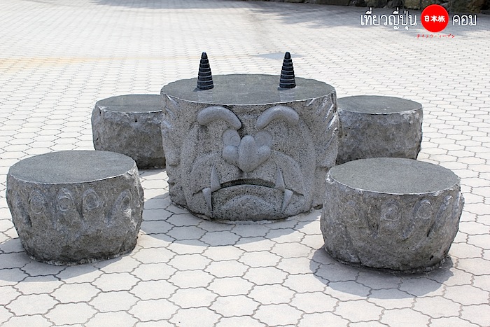 ด้านในมีโต๊ะหินที่แกะสลักเป็นรูปหน้ายักษ์และมีเขาด้วย น่ารักมาก