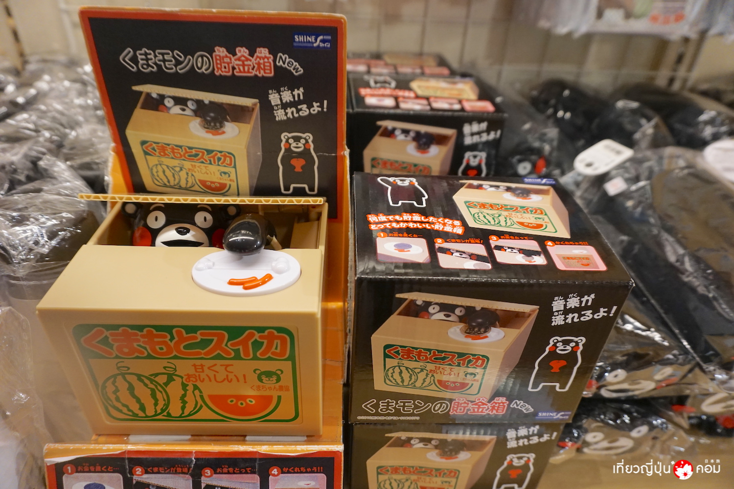 ที่จุดขายของฝาก มีของที่ระลึกจากคุมะมงเยอะแยะมากมาย และนี่คือสิ่งที่เราชอบมากที่สุด ก็คือกระปุกออมสินคุมะมง ที่วางเงินไปแล้ว คุมะมงจะแอบเอามือขึ้นมาเขี่ยเหรียญของเราลงไปเก็บให้ คาวาอี้~
