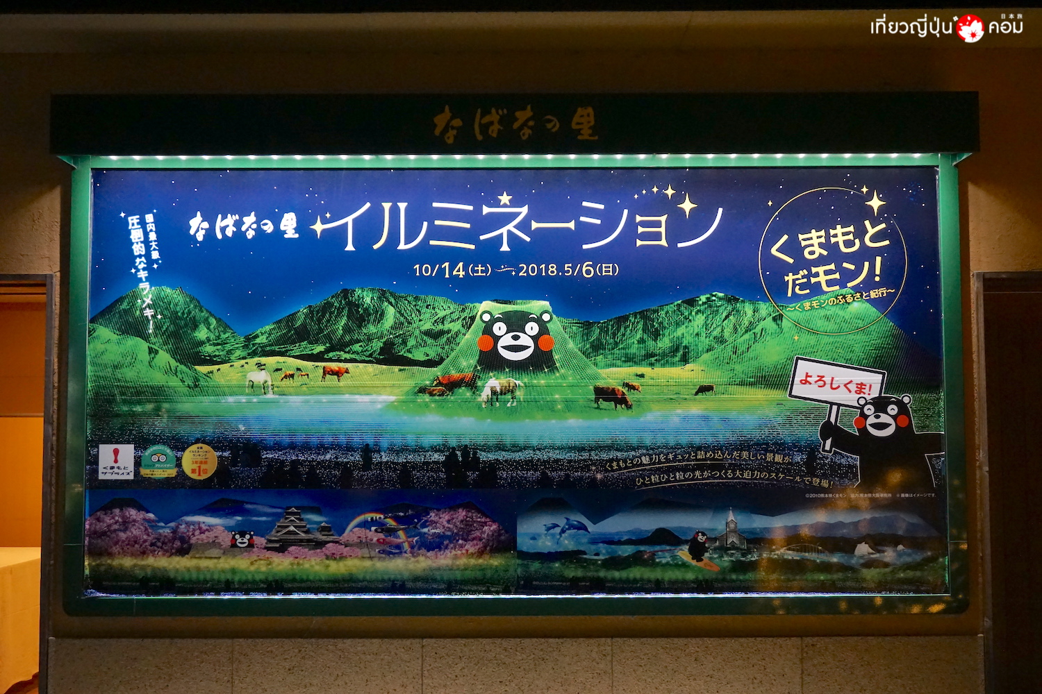 ส่วนโปรแกรมปิดท้ายของทริปนี้ เราเดินทางมาชมงานเทศกาลประดับไฟหน้าหนาวที่ยิ่งใหญ่ที่สุดงานหนึ่งของญี่ปุ่น นาบานะโนะซาโตะ (Nabana no Sato) ที่จะเริ่มจัดตั้งแต่ช่วงฤดูใบไม้ร่วงไปจนถึงฤดูใบไม้ผลิ จัดขึ้นที่ธีมพาร์คสวนดอกไม้และสวนน้ำชื่อดังที่ Nagashima Resort เมืองคุวะนะ (Kuwana) ในจังหวัดมิเอะ ดูรายละเอียดงาน >> ที่นี่