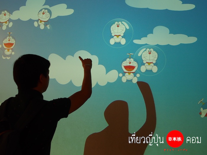 เครื่องเล่นอันนี้จะมีเซนเซอร์จับ ใช้เงาของเราไปจิ้มลูกโป่งให้แตกแล้วโดราเอมอนก็จะร่วงลงไป